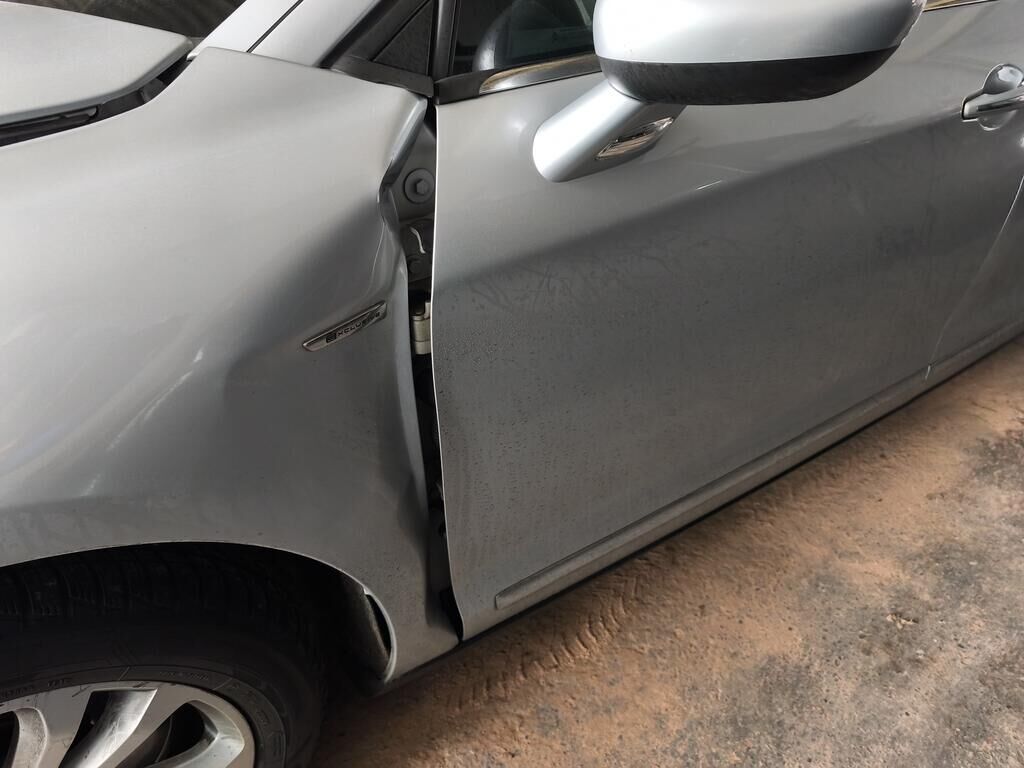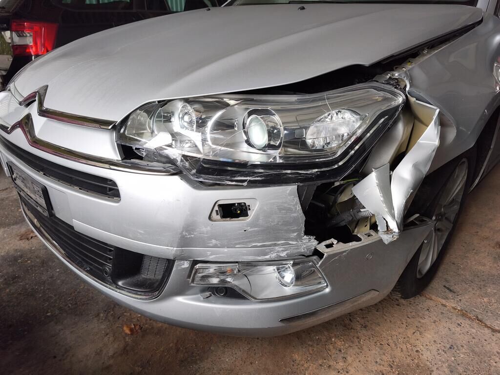 Die Front des Fahrzeuges ist gestaucht und nach rechts verschoben.