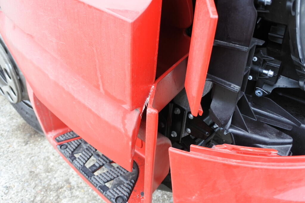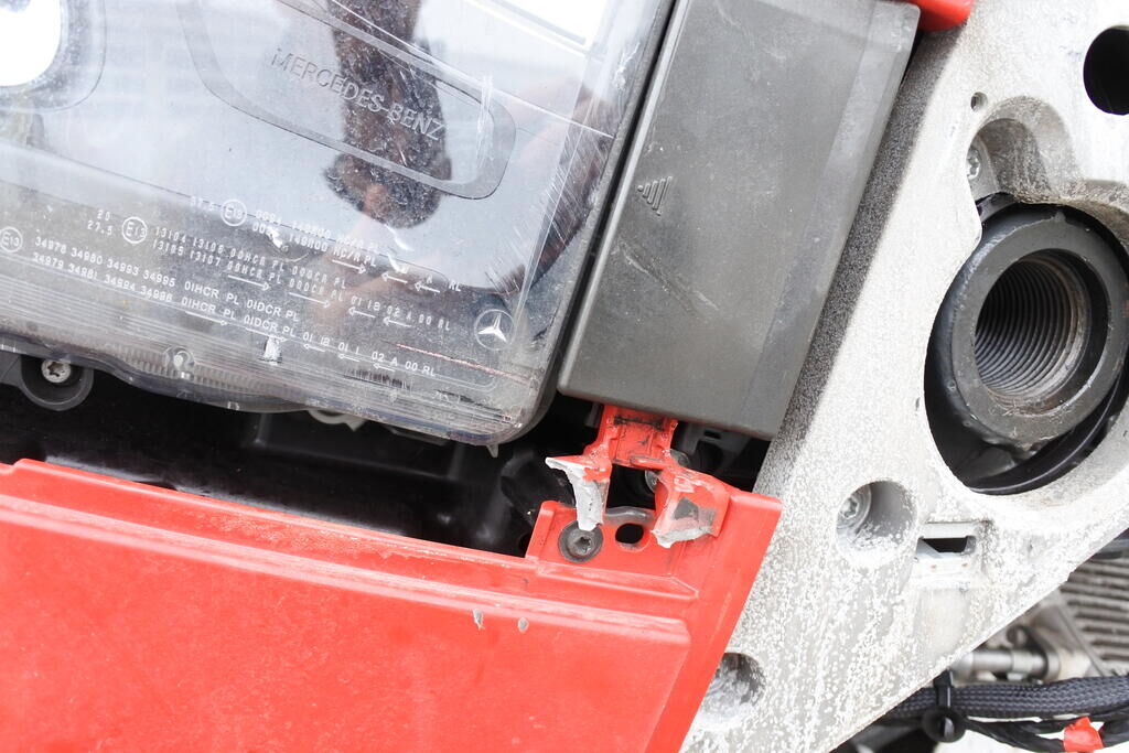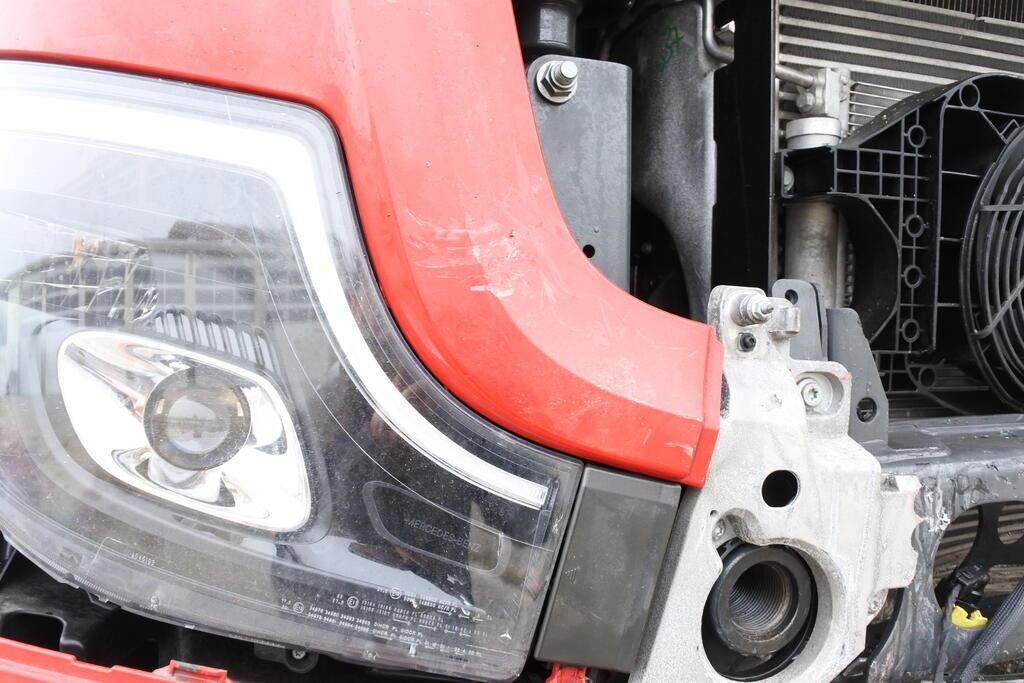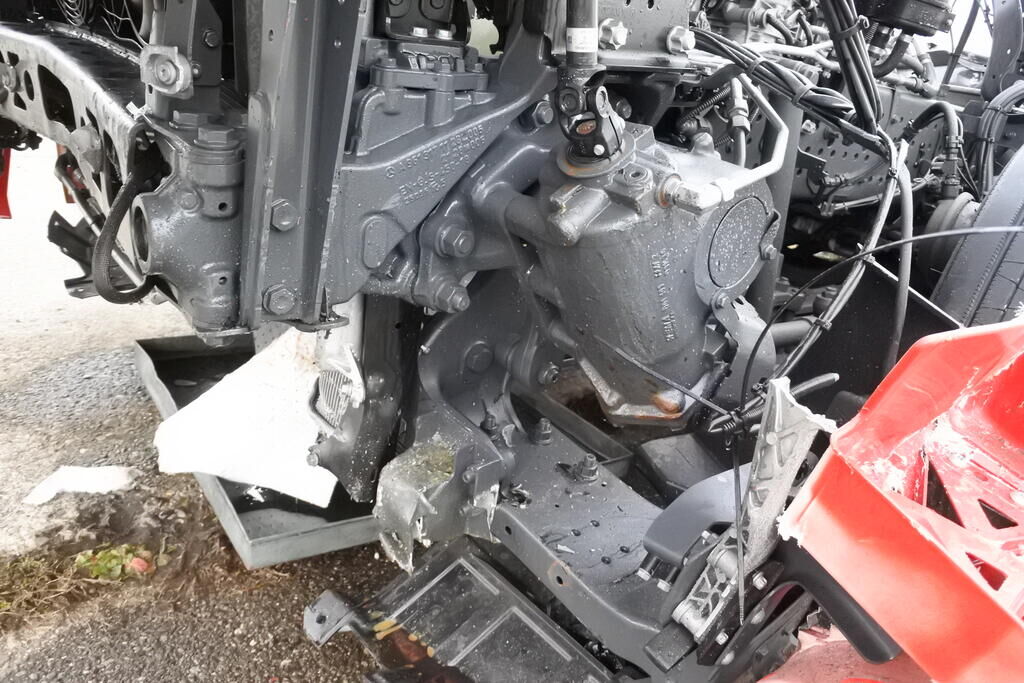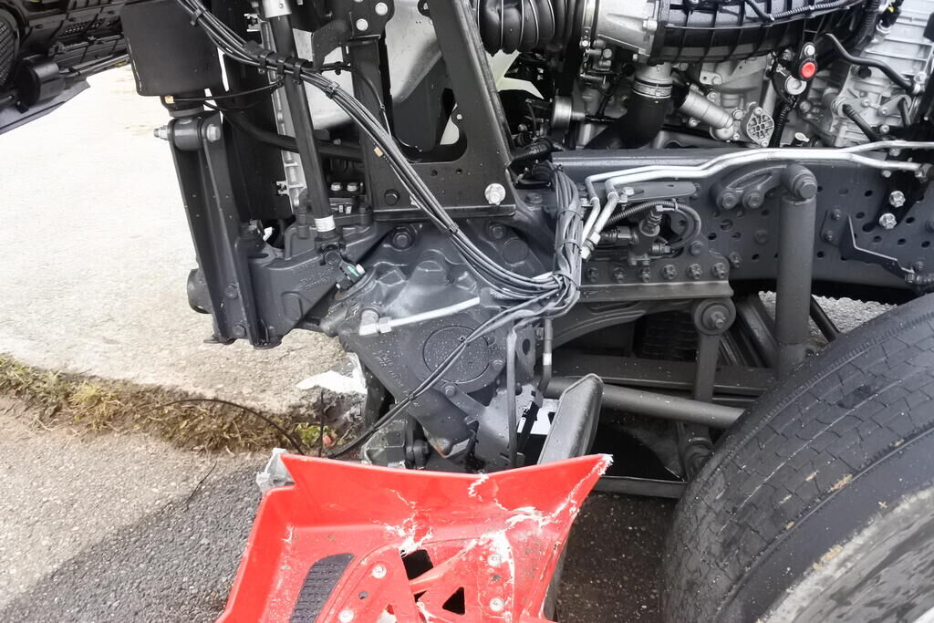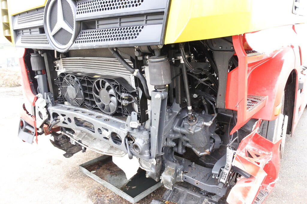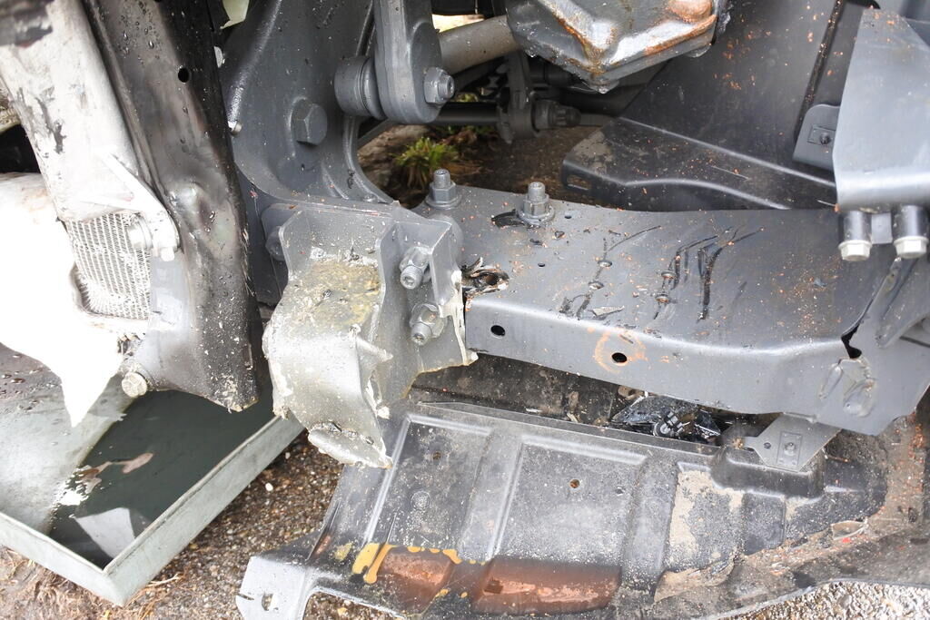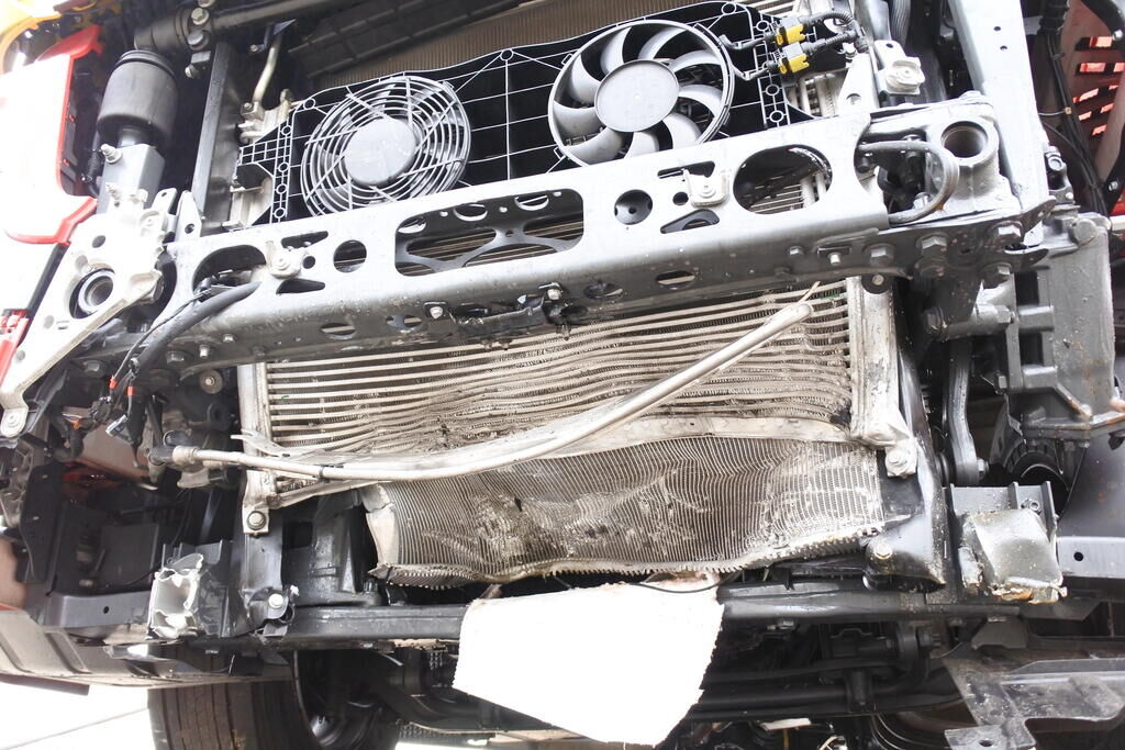 Die Stossstange mit Verstärkung, Querträger, Halter und beide Ecken mit Nebellampen, beide Scheinwerfer mit Blenden, die Quertraverse mit Aufnahmen, die gesamte Kühlanlage mit Ventilation und Luftführungen, der Grill, der Einstieg links, beide Türverlängerungen, beide Türrahmen, die Beifahrertür, der Aufprallträger mit Halterung, beide Gussstreben unten sind beschädigt. Beide Chassisköpfe weisen Verformungen/verdrehungen auf. Risiko Motor, Kühlanlage wurde auf Kurbelwelle gedrückt.