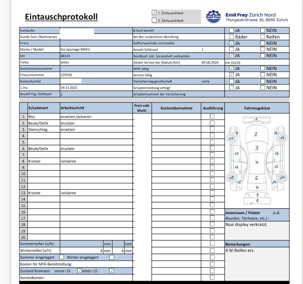 | Keine technische Prüfung (Werkstatttest) vorgenommen Diverse Schäden an Karosserie/Lack. Fahrzeug ab Platz, ohne Garantie und Aufbereitung. DPF/FAP Filter nicht kontrolliert 8-fach bereift. Keine Gewähr auf die Angaben der Sonder- und Serienausstattung / keine mechanische Prüfung. Fahrzeug wurde unzerlegt expertisiert / keine Haftung für allfällige, nach Demontage bekanntwerdenden Mängel. Fahrzeugbereifung und Ausstattung gemäss Fotos / Fahrzeugkauf auf eigenes Risiko ab Platz ohne Nachwährschaft. - diverse Kratzer und Dellen am gesamten Fahrzeug - kleine Steinschläge auf der Frontscheibe - Riss an der Stosstande (siehe Fotos) | |