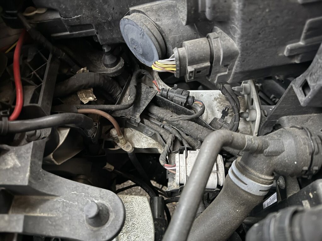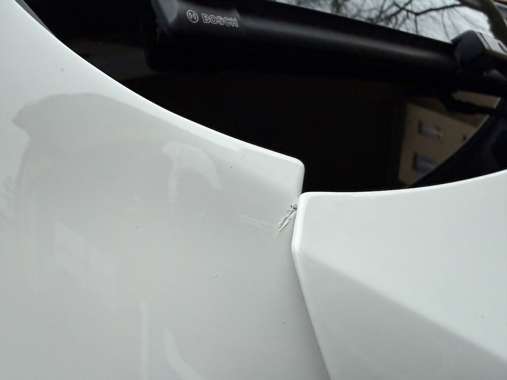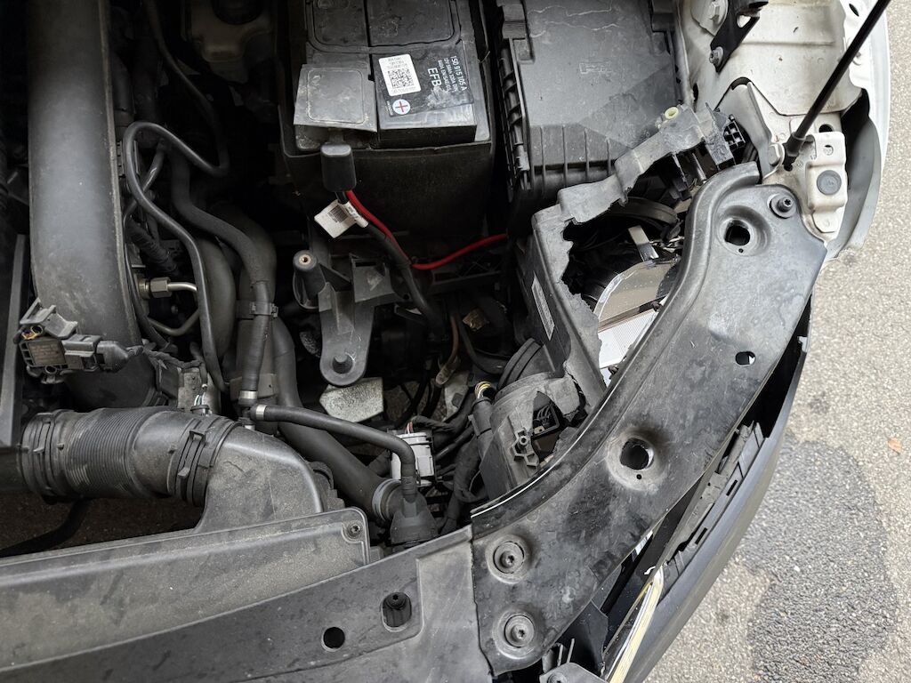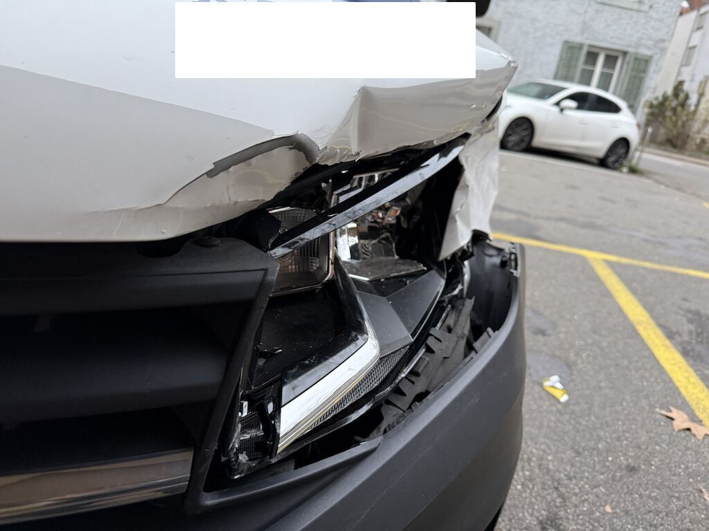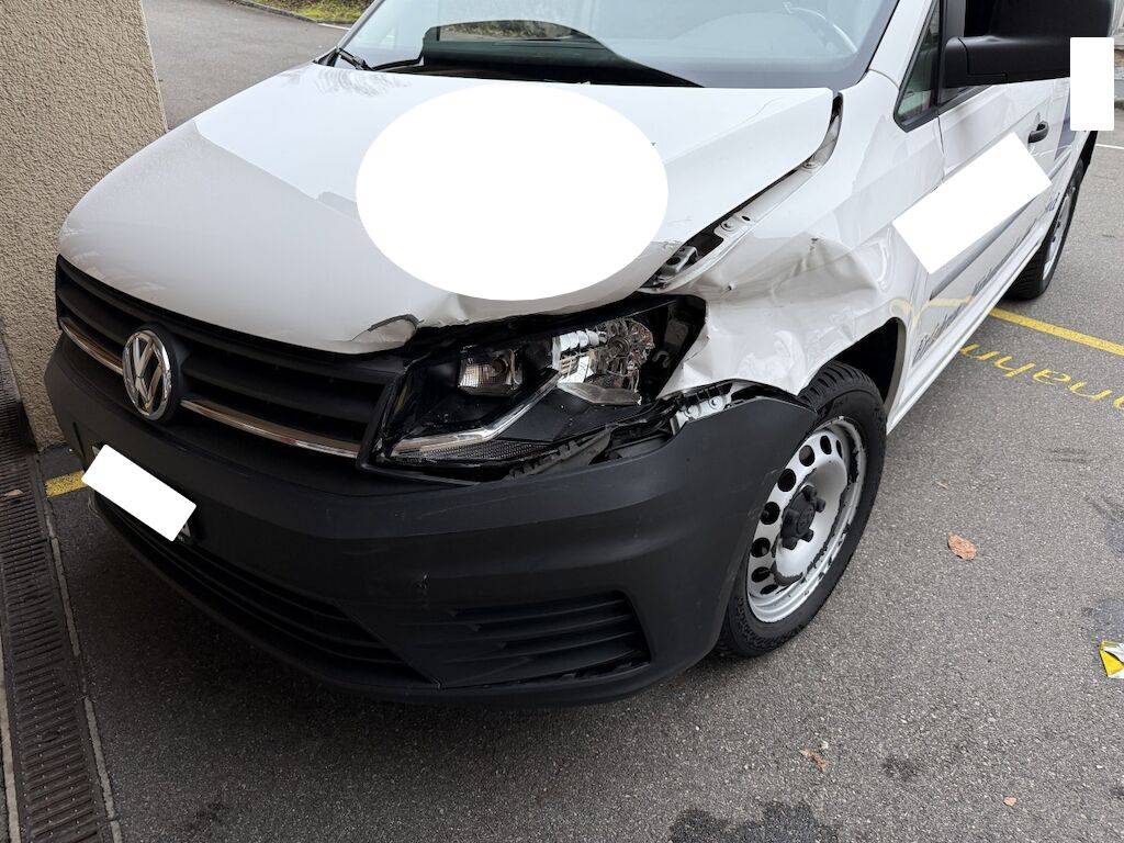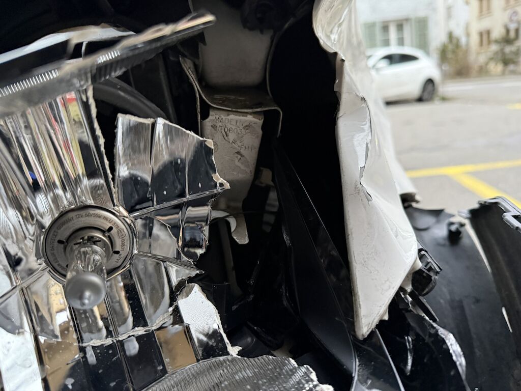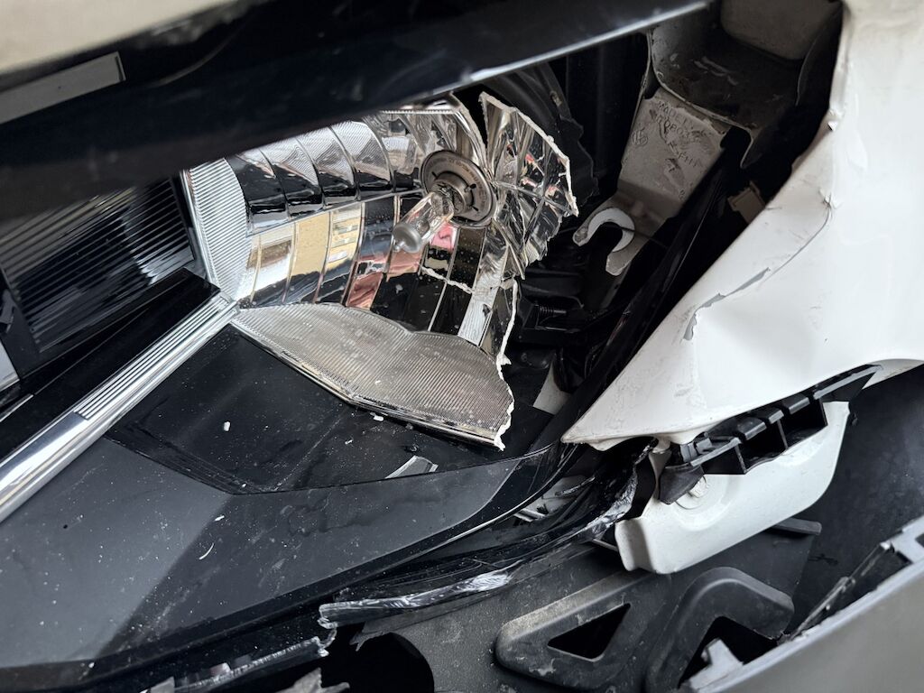 Frontschaden links: Stossfänger mit Verkleidungen gebrochen. Scheinwerfer gerissen. Kotflügel und Motorhaube aufgestossen und ganze Front nach rechts verschoben. Hohes Risiko an zusätzlichen Schäden beim Zerlegen.