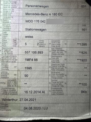 Wichtige HinweiseZustandFahrzeug muss transportiert werden [Höhe und Breite beachten]. Fahrzeug ist NICHT fahrbar. Fahrzeug ist rollbar. Motor startet nicht, Ursache unbekannt. Bereifung Fahrzeug wird mit Winterräder abgegeben. Weitere wichtige Hinweise Kindersitz wird ausgebaut Motor startet und stellt wieder ab BeschädigungenLinks Linke Seite beschädigt. Rechts Rechte Seite beschädigt. Front Front rechts eingedrückt. Frontblech/Maskenblech eingedrückt. Achse Risiko Lenkung. Elektrik Kabelstränge verbrannt, beschädigt, abgerissen. Sonstige Schäden Beschädigungen Div.Carrosserie Teile sind leicht beschädigt. Weitere Beschädigungen Risiko Kühler Risiko Aufhängungsteile vorne rechts AusstattungSerienaustattung Airbag Fahrer und Beifahrerseite Elektronische Wegfahrsperre Elektrische Fensterheber Aussenspiegel elektrisch verstellbar und heizbar Wärmedämmendes Glas ABS Antiblockiersystem Seitenairbag Fahrer und Beifahrerseite Aussentemperaturanzeige Zentralverriegelung mit Innenschalter Sitzbelegungserkennung für Beifahrerairbag Klimaanlage mit Pollenfilter Isofix-Vorbereitung Rücksitze aussen Einzeln abklappbare Rücksitzlehnen 60/40 Knieairbag Fahrer Tempomat inklusiv Speedtronic Berganfahrhilfe Windowbags vorne Attention Assist Leichtmetallräder 16" 10-Speichen ESP inkl. ASR Keine Gewähr auf die Angaben der Serienausstattungen Radio/ USB Audio 5 Pack Sitzkomfort Ausstattung Style Collision Prevention Assist SonderausstattungSitzheizung vorne Bi-Xenon-Scheinwerfer Rückfahrkamera Wärmedämmendes Glas dunkel getönt 4 Winterreifen anstelle Sommerreifen Radio/ CD Audio 20/ CD-Wechsler Aktiver Parkassistent mit Parktronic Pack Spiegel Navigationsmodul Map Pilot Media Interface in Mittelarmlehne Pack Licht u. Sicht Ausstattung Leder-Ausstattung Leichtmetall-Felgen Sommer-Reifen [OHNE Felgen] |