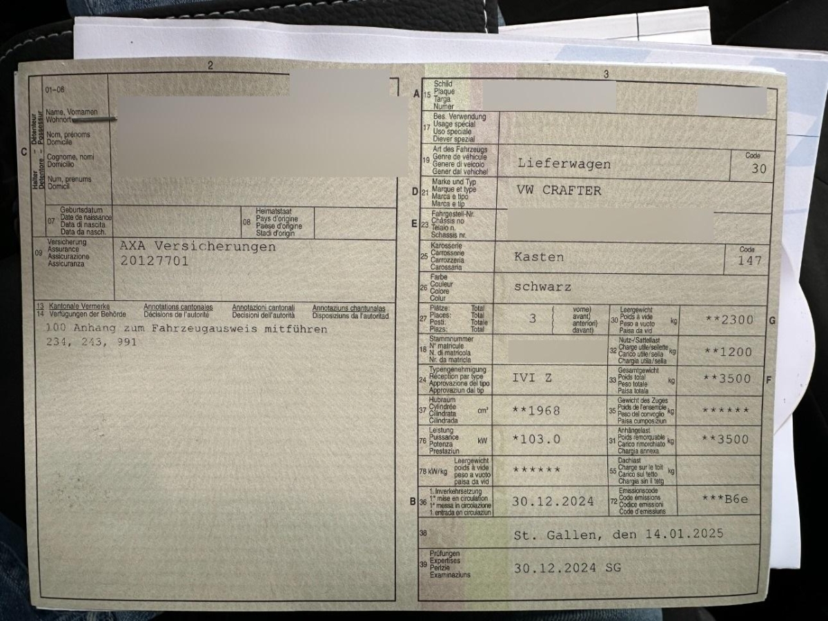 Räder: Radabdeckung mitte, 12-V-Steckdose und 2 Becherhalter in der Armaturentafel, Dreipunkt-Automatiksicherheitsgurte mit Gurthöhenverstellung und elektrischen Gurtstraffern vorn, Abschleppöse vorn, Licht: Nebelschlussleuchte, Garantie: VW Anschlussgarantie (2+3 Jahre, max. 200'000km), Handschuhfach und Ablagefächer im Armaturenbrett, LED Fahrerhausbeleuchtung, Stossstangen vorne in Grau, Räder: Reifendruck-Kontrollsystem (direkt messend), Haltegriff an der A-Säule auf Fahrer- und Beifahrerseite, Mittelausströmer, seitliche Ausströmer, Fussraumausströmer und Defrosterdüsen, Media: Digital Cockpit Pro (10´´-TFT-Farbdisplay), 4 Becherhalter im Fahrerhaus, Media: Digitaler Radioempfang DAB+, Vorderachse mit McPherson Federbeinen, Stabilisator und Koppelstange, Fahrwerk: Vorderachse (1.800 kg Traglast), Ablagefächer in den Fahrerhaustüren, Lackierung: Uni-Lackierung, Aussenspiegel konvex, mit integrierter LED-Blinkleuchte und Weitwinkelbereich, Assist: Multifunktionskamera, Ohne Seitenverkleidung im Fahrgast-/ Laderaum, Assist: Spurhalteassistent "Lane Assist", Dachgalerie mit 2 DIN Schächten und Leseleuchte, Licht: Tagesfahrlichtschaltung mit Assistenzfahrlicht, Wegfahrsperre, elektronisch, Bordwerkzeug, Wärmeschutzverglasung rundum, Polster: Sitzbezüge in Stoff, Dessin Austin, Räder: Stahlfelgen 16" mit Reifen 205/75 R16, Türen: Heckflügeltüren hinten mit Fenster, Öffnungswinkel 180°, Scheibenbremsen vorne und hinten, Vorbereitung Alcohol Interlock, Türen: Schiebetüre rechts, Lenkrad: Multifunktionslenkrad aus Kunststoff, Haltegriff an der Trennwand im Lade-/ Fahrgastraum, Kühlerschutzgitter, unlackiert, Trittstufen in Frontstossstangen, Assist: Ablenkungs- und Müdigkeitserkennung, Elektrische Klemmleiste und Vorbereitung für Funktionssteuergerät, Instrumenteneinsatz (km/h); Anzeigen für Geschwindigkeit, Gesamt-/Tagesstrecke - Drehzahl, Kraftstoffvorrat und Uhrzeit, Getriebe: Ohne Nebenantrieb von Getriebe, 2 12-V-Steckdosen im Fahrerhaus (in der Schalttafel), Beleuchtung im Laderaum: 2 Spots, Aussenspiegel, elektrisch einstell- und beheizbar, Innenspiegel abblendbar, Zentralverriegelung "Keyless-Go" ohne Safesicherung, Assist: Seitenwindassistent, Räder: Sommerreifen, Licht: Drittes Bremslicht, Hinterachse als Starrachse mit Längsblattfedern und Anschlagpuffern, Servolenkung, Verzurrösen zur Ladegutsicherung, 2 Funkklappschlüssel, Bodenbelag im Fahrerhaus aus Gummi, Ohne Steckdose(n) im Fahrgast-/ Laderaum, Sitze: 2 Einzelsitze im Fahrerhaus, Getriebe: 6-Gang-Getriebe manuell, Klima: Heiz- und Frischluftanlage mit mehrstufigem Frischluftgebläse, Umluftbetrieb, Seitenscheiben vorn und hinten und Heckscheibe in Wärmeschutzglas, Assist: Einparkhilfe im Front- und Heckbereich, Assist: Berganfahrassistent, Licht: Leuchtweitenregulierung, Elektrische Fensterheber im Fahrerhaus, Elektromechanische Lenkung, Lenkrad in Höhe und Reichweite verstellbar, Motor-Start-Stopp-System mit Bremsenergie-Rückgewinnung, Trennwand, mit festem Fenster, Heckscheibenheizung, Assist: Verkehrszeichenerkennung, Räder: Tire Mobility Set (Reifendichtmittel und 12 Volt Kompressor), Assist: Front Assist mit Warnen und Bremsen auf Fahrzeuge, Fussgänger und Radfahrer, Lenkradsperre, 75 Liter Treibstofftank, Elektromechanische Parkbremse (EPB), Airbag: Airbag für Fahrer und Beifahrer mit Beifahrer-Airbag-Deaktivierung, ESP, elektronisches Stabilitätsprogramm und ABS, Genarbte Kunststoffseitenschutzleisten