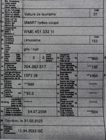 Wichtige HinweiseVerkaufDer Verkauf erfolgt durch den Halter in Zusammenarbeit mit der Firma TeamConsulting, nicht durch die XpertCenter AG. Das Fahrzeug muss bei Abholung bar vor Ort bezahlt werden. Zusätzlich zum Gebot fällt eine Handlinggebühr an. Schlüssel Nur ein Schlüssel vorhanden. Weitere wichtige Hinweise Echappement endommagé [bruit important], risque de dégât moteur. Train avant endommagé BeschädigungenHeck Heck eingedrückt. Heckblech eingedrückt. Kofferboden eingedrückt. Heckklappe eingedrückt. Motor Risiko Motor. Achse Hinterachse rechts beschädigt. AusstattungSerienaustattung Airbag Fahrer und Beifahrerseite Elektronische Wegfahrsperre Elektrische Fensterheber ESP Elektronisches Stabilitätsprogramm Panoramadach Zentralverriegelung mit Fernbedienung Gepäckraumabdeckung Lederschaltknauf Automatisches Schaltprogramm ABS und EBV Elektr. Bremskraftverteilung inkl. BA Aussentemperaturanzeige mit Frostwarnung Sonnenschutz für Glasdach Sicherheitszelle Tridion/ metallic silver Lederlenkrad 2-Speichen Klimaanlage geregelt/ Staub und Pollenfiter Leichtmetallräder 15" 12-Speichen R72 Keine Gewähr auf die Angaben der Serienausstattungen SonderausstattungAussenspiegel elektrisch verstellbar und heizbar Servolenkung elektrisch Sport-Lederlenkrad 3-Sp. mit Lenkradschaltung Smart Radio Nine/ CD/ 2 Lautsprecher Smart Soundsystem inkl. Subwoofer Pack Audio Pack Komfort/ Licht Handschuhfach abschliessbar Metallic-Lackierung/ Bodypanel Silver |