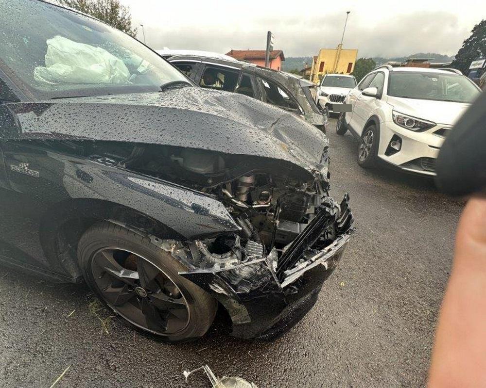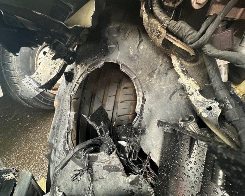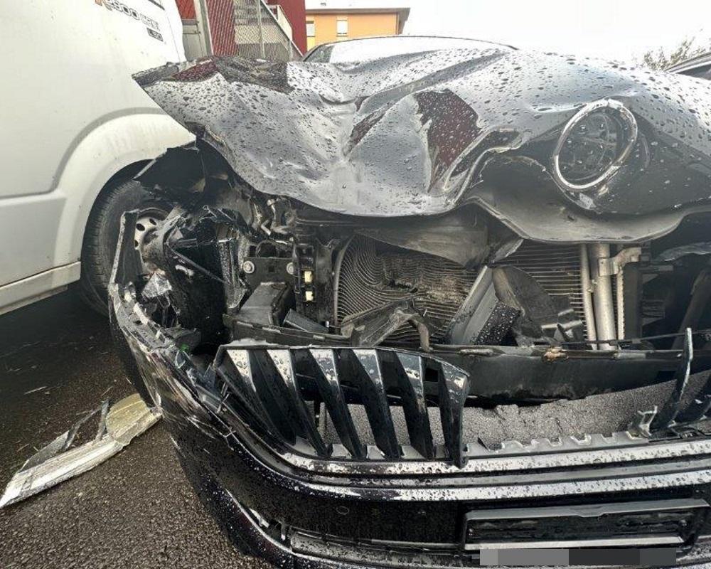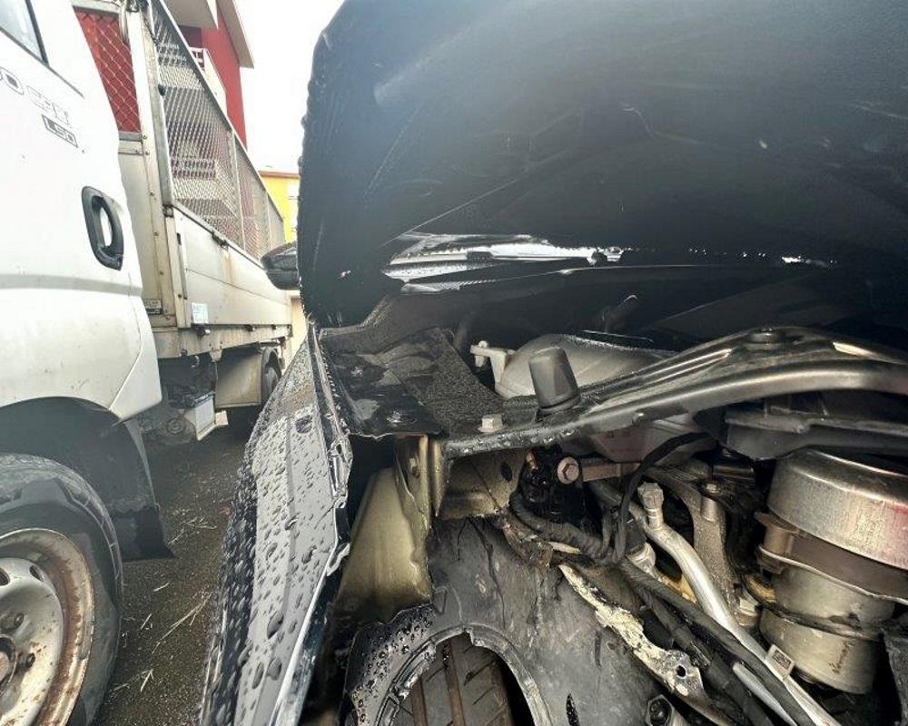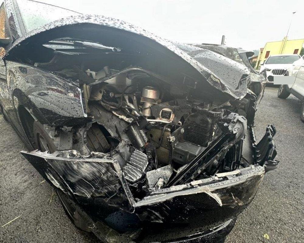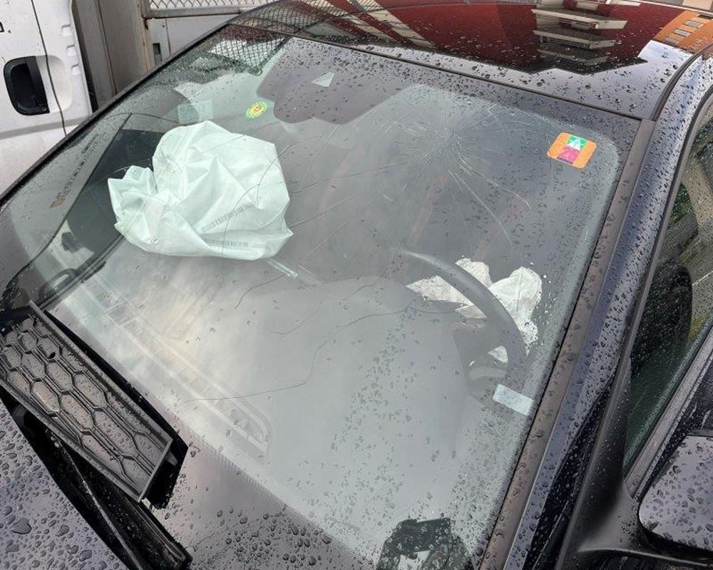 A-Säule, Airbag ausgelöst, Armaturenbrett, Federbein vorne rechts, Front, Front links, Front rechts, Frontscheibe, Gurtstraffer ausgelöst, Kabelstrang, Klimakühler, Kotflügel rechts, Kühler, Kühlgitter, Ladeluftkühler, Lenkung, Längsträger vorne rechts, Motorgehäuse, Motorhaube, Querträger, Rad vorne rechts, Radaufhängung vorne rechts, Radhaus vorne rechts, Scheinwerfer links, Scheinwerfer rechts, Stosstange vorne, Vorderachse