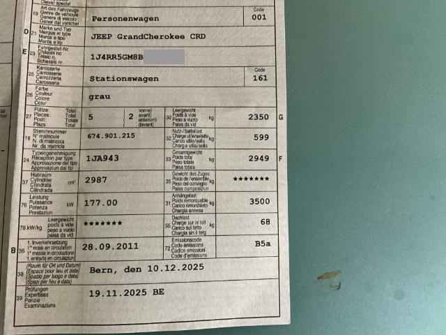 Wichtige HinweiseDemontagePersönliche Gegenstände oder Ladegut im Fahrzeug werden entfernt. Bereifung Fahrzeug wird mit Winterräder abgegeben. BeschädigungenFront Frontblech/Maskenblech eingedrückt. Motor Alle Kühler vorne sind eingedrückt. Motorstörung: Warnleuchte aktiv Sonstige Schäden Div.Carrosserie Teile sind leicht beschädigt. AusstattungSerienaustattung Airbag Fahrer und Beifahrerseite Elektrische Fensterheber Tempomat Bordcomputer Schiebedach elektrisch Servolenkung Seitenairbag Fahrer und Beifahrerseite Zentralverriegelung mit Fernbedienung Innenspiegel automatisch abblendbar Scheibenwischer mit Regensensor Reifendruck-Kontrollsystem RDK Aussenspiegel automatisch abblendbar Quadra-Drive [Antriebssystem] ESP/ ASR Xenon-Scheinwerfer inkl. Waschanlage Lendenwirbelstützen Vordersitze Aussenspiegel elektrisch verstellbar/ heizbar und anklappbar Alarmanlage mit Innenraumüberwachung Memory für Fahrersitz und Aussenspiegel Isofix-Kindersitzbefestigung Dunkelgetönte Scheiben hinten Sitzheizung vorne + hinten ABS und Bremsassistent BAS Zwei Zonen-Klimaautomatik Holz- Lederlenkrad beheizbar Vordersitze elekt. verstellbar mit Memory für Fahrersitz Leichtmetallfelgen 20" Nebelscheinwerfer vorne Heckscheibe aufklappbar Premium-Soundsystem Vorhang Seitenairbags vorne + hinten Knieairbag Fahrer Dieselpartikelfilter Luftfederung Keyless Schliess- und Startsystem HSA Berganfahrassistent Adaptive Geschwindigkeitsregelung ACC Park-Distanz-Sensor vorne + hinten/ Rückfahrkamera Zentraldifferential Heckklappe elektrisch Toter-Winkel-Warnsystem HDC Hill Descent Control/ Bergabfahrkontrolle Premium Fussmatten Rücksitzlehne geteilt umklappbar Pack Interieur Premium Sitzbezüge in Nappa Leder Dachairbags ERM Electronic Roll Mitigationl/ Wank- und Überrollschutz Reserverad vollwertig Automatische Tagfahrlichtschaltung Vordersitze belüftet Pack Uconnect Multimedia Keine Gewähr auf die Angaben der Serienausstattungen |
