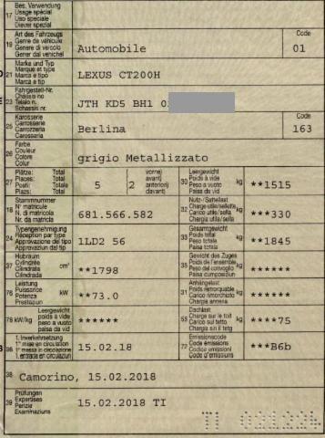 Wichtige HinweiseZustandFahrzeug ist fahrbar. Fahrzeug ist rollbar. Bereifung Fahrzeug wird mit Winterräder abgegeben. Sonstiges Fahrzeugdokumente vorhanden. Schlüssel Beide Schlüssel vorhanden. BeschädigungenLinks Linke Seite beschädigt. Rechts Rechte Seite beschädigt. Tür vorne rechts ist eingedrückt. Front Front eingedrückt. Kotflügel vorne links eingedrückt. Heck Heck eingedrückt. Seitenwand hinten rechts eingedrückt/aufgestaucht. Sonstige Schäden Div.Carrosserie Teile sind leicht beschädigt. Beschädigungen Weitere Beschädigungen Beide Seitenspiegel Kratzer. Stossstange hinten und vorne. AusstattungSerienaustattung Airbag Fahrer und Beifahrerseite Sitzheizung vorne Tempomat ABS Antiblockiersystem Lederlenkrad Kopfairbag vorne und hinten Scheibenwischer mit Regensensor EBD Elektronischer Bremskraftverteiler Leichtmetallfelgen 16" Park-Distanz-Sensor vorne + hinten Diebstahlwarnanlage mit Innenenraum-Überwachung Stabilitätskontrolle Zwei Zonen-Klimaautomatik Rückfahrkamera Scheinwerfer Reinigungsanlage Seitenairbags vorne Automatisch abblendbarer Innenspiegel Vordersitze elektrisch verstellbar mit Memory Knieairbag Fahrer und Beifahrerseite Bluetooth Interface fürs Mobiltelefon Isofix-Kindersitzbefestigung hinten Elektr. Lendenwirbelstütze Fahrersitz Lederausstattung Soundsystem Reifendruck-Überwachungsanzeige Berganfahrhilfe Fernlichtassistent Anschluss USB und AUX Reifenreparatur-Kit Spurhalteassistent LKA Pre Crash System PCS LED-Scheinwerfer LED Tagfahrlicht Aussenspiegel el.verstell-heiz-anklappbar/abblendbar/Memory Keine Gewähr auf die Angaben der Serienausstattungen LED-Nebelscheinwerfer Audiosystem Mark Levinson Digitaler Radioempfang DAB+ Smart Entry Verkehrsschild-Erkennungssystem Premium Navigationssystem Gratis-Service 10 Jahre/ 100'000 km SonderausstattungMetallic-Lackierung Glasschiebe-/ Hebedach Getönte Scheiben |