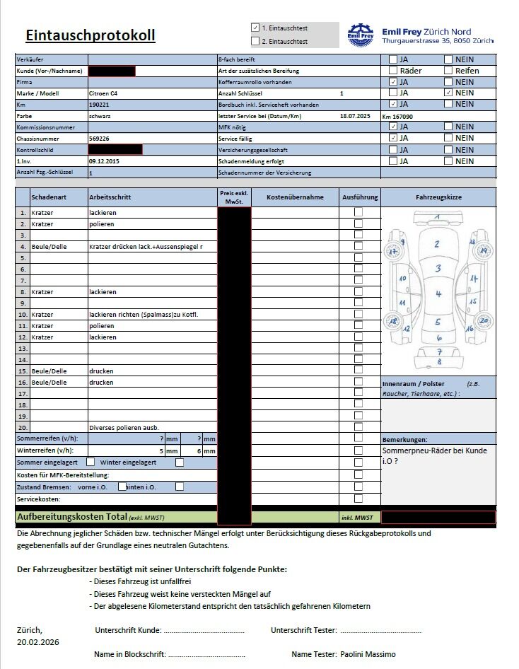 | Keine technische Prüfung (Werkstatttest) vorgenommen Diverse Schäden an Karosserie/Lack. Fahrzeug ab Platz, ohne Garantie und Aufbereitung. DPF/FAP Filter nicht kontrolliert Keine Gewähr auf die Angaben der Sonder- und Serienausstattung / keine mechanische Prüfung. Fahrzeug wurde unzerlegt expertisiert / keine Haftung für allfällige, nach Demontage bekanntwerdenden Mängel. Fahrzeugbereifung und Ausstattung gemäss Fotos / Fahrzeugkauf auf eigenes Risiko ab Platz ohne Nachwährschaft. - Div. Kratzer am Fahrzeug Polieren/ Lackierien - Beule/ Dellen drücken - MFK nötig | |