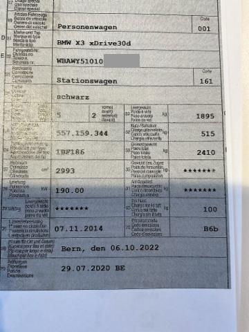 Wichtige HinweiseKategorieDas Fahrzeug wird vom Besitzer noch benutzt. BeschädigungenLinks Linke Seite beschädigt. Anstoss links im Bereich der B-Säule. Sonstige Schäden Div.Carrosserie Teile sind leicht beschädigt. AusstattungSerienaustattung Fahrer und Beifahrer-Airbag Seitenairbag für Fahrer und Beifahrer Schwarze Instrumententafel Reifendruck-Kontrollsystem RDC Innenspiegel automatisch abblendbar Durchladesystem Armauflage vorn Xenon-Licht Nebelscheinwerfer vorne Dynamische Stabilitäts-Control DSC Antiblockiersystem ABS Scheinwerfer-Waschanlage Kindersitzbefestigung Isofix Hill Descent Control HDC Lederlenkrad Velours-Fussmatten Uni-Lackierung Multifunktions-Lenkrad Kopfairbags vorne + hinten Dynamische Traktions-Control DTC Dieselpartikelfilter Geschwindigkeitsregelung mit Bremsfunktion Lenksäule mit Höhen- und Längseinstellung Deaktivierung Beifahrerairbag Klimaautomat 2-Zonen inkl. Mikrofilter Digital audio DAB-Tuner Interieurleisten Satinsilber matt Auto Start Stopp Funktion Performance Control [Drehmomentverteilung] Leichtmetallräder Y-Speiche 305 Keine Gewähr auf die Angaben der Serienausstattungen Pack Swiss-Premium SonderausstattungLenkradheizung Sitzheizung für Fahrer und Beifahrer Innen- und Aussenspiegel automatisch abblendbar Automatische Heckklappenbetätigung Regensensor Klimakomfort/ Frontscheibe Sportliche Fahrwerksabstimmung Pack M Aerodynamik Pack Ablage M-Lederlenkrad Navigationssystem Professional Sportsitze für Fahrer und Beifahrer HiFi-Lautsprechersystem Park Distance Control PDC vorn und hinten Head-Up Display Individual Hochglanz Shadow-Line Interieurleisten Aluminium Längsschliff fein Fernlichtassistent BIN Dachhimmel anthrazit Dachreling Aluminium satiniert Sportlenkung variabel LED-Nebelscheinwerfer Adaptive LED-Scheinwerfer M Leichtmetallräder Doppelspeiche 310/ Mischbereifung |