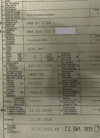 WBAPD51050W******Wichtige HinweiseZustandFahrzeug ist fahrbar. Sonstiges Fahrzeugdokumente vorhanden. Schlüssel Nur ein Schlüssel vorhanden. BeschädigungenHeck Heck eingedrückt. Heckklappe eingedrückt. Innenraum Innenraum ungepflegt. Starke Verschmutzung im Innenraum. Sonstige Schäden Vorschaden Hagel leicht. Div.Carrosserie Teile sind leicht beschädigt. Div. Roststellen am Fahrzeug. Lackierung matt [stumpf, beschädigt]. Hagel Hagelschaden leicht. Weitere Beschädigungen Risiko Anhängervorrichtung Risiko Heckblech Risiko Abgasanlage Beschädigungen Risiko Getriebe - Differenzial - Motor -> starker Ölverlust! Reparatur Kosten/Umfang nicht abschliessend AusstattungSerienaustattung Klimaautomatik inkl. Mikrofilter Fahrer und Beifahrer-Airbag Seitenairbag für Fahrer und Beifahrer Aussenspiegel elektrisch verstellbar und heizbar Armauflage vorn Zentralverriegelung Fernbedienung für Zentralverriegelung Gepäckraum-Trennnetz Aussentemperaturanzeige Wärmeschutzglas grün Nebelscheinwerfer vorne Dynamische Stabilitäts-Control DSC Antiblockiersystem ABS Servolenkung Cornering Brake Control CBC Hill Descent Control HDC Lederlenkrad Heizbare Scheibenwaschdüsen 12 V Steckdose Lenkrad verstellbar Mittelarmlehne im Fond Bordcomputer Exterieurumfänge in Wagenfarbe Getränkehalter Radio BMW CD Reifenpannen-Anzeige Stoff Network Fensterheber elektrisch vorne + hinten Leichtmetallräder Doppelspeiche 148 Kopfairbags vorne + hinten Dieselpartikelfilter Keine Gewähr auf die Angaben der Serienausstattungen SonderausstattungCD-Wechsler BMW CD 6 Selection Multifunktions-Lenkrad inkl. Geschwindigkeitsregelung Sport-Lederlenkrad Elektrische Sitzverstellung mit Memory Sitzheizung für Fahrer und Beifahrer Skisack Innenspiegel automatisch abblendbar Chrome Line Exterieur Xenon-Licht Blinkleuchten weiss Dachreling Servotronic Sportliche Fahrwerksabstimmung Pack Ablage Kindersitzbefestigung Isofix Diebstahlwarnanlage Seitliche Trittbretter Navigationssystem Professional Scheinwerfer-Waschanlage Sportsitze für Fahrer und Beifahrer HiFi-Lautsprechersystem Regensensor und automatische Fahrlichtsicherung Anhängerkupplung mit abnehmbarem Kugelkopf Leichtmetallräder Sternspeiche 143 Pack Dynamic/ Advantage und Comfort Ausstattung Metallic-Lackierung |