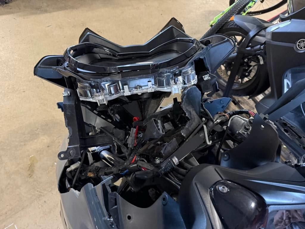 Armaturen, Auspufftopf, Aussenspiegel links, Aussenspiegel rechts, Front, Fussraster links, Fussraster rechts, Gabelholm, Griff links, Griff rechts, Heckverkleidung, Kabelstrang, Kühler, Lenkanschlag, Lenker, Lenkschloss, Rad vorne, Rahmen, Scheinwerfer, Schutzblech vorne, Seite links, Seite rechts, Verschalungen hinten, Verschalungen rechts, Verschalungen vorne, Windschutzscheibe