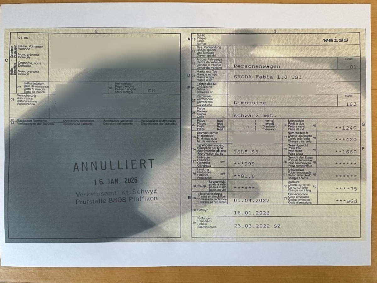 | Fahrzeugausweis | Vorhanden |