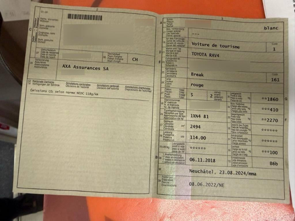 Drehzahlmesser, Leseleuchten vorne, Wegfahrsperre elektronisch, Assist: Müdigkeitserkennung, Aussenspiegel rechts und links beheizt, elektrisch verstell- / und einklappbar, Kabelloses Ladesystem für mobile Endgeräte, Laderaumabdeckung, Heckscheibenheizung, Rear Cross Traffic Alert (Rückwärts-Auspark-Assistent), Kartentaschen an den Rückenlehnen, 3 Kopfstützen hinten, Scheibenwischer vorne mit Intervall, Teppichfussmatten, Lenkrad: Lederlenkrad, Licht: Nebelscheinwerfer, Sitze mit Schleudertrauma-Schutzsystem, Licht: Innenraumbeleuchtung, Sitze: Kreuzstütze für Fahrersitz elektrisch verstellbar, Automatisches Einschalten der Abblendlichter, Scheibenwischerablage beheizt, Aussenspiegel und Türgriffe in Wagenfarbe, Lackierung: Uni-Lackierung, Zentralverriegelung mit Fernbedienung, Lenkrad: Lenkradheizung, Licht: Frontscheinwerfer rund, Steckdose 12V, Regensensor für Scheibenwischer vorne, Licht: Automatisches Fernlicht, Ablagen in den Türen, Notrad, Cupholder vorne und hinten, Assist: Berganfahrhilfe (Hill Assist Control - HAC), ABS, EBD elektronische Bremskraftverteilung, Media: AUX-Anschluss, Integriertes Fahrdynamikmanagement VDIM, Sitze: Vordersitze heizbar, Drittes Bremslicht LED, Assist: Totwinkel-Assistent, Digital Uhr, Airbag: Airbag Fahrer und Beifahrer, Höhenverstellbare Gurten vorne, Airbag: Knie-Airbag für Fahrer, Airbag: Seitenairbag für Fahrer und Beifahrer, Farbmonitor, Beide Make up-Spiegel beleuchtet, Mittelkonsole mit Ablagefach, Anhänger Stabilisierungkontrolle TSA, Aschenbecher, Sprachsteuerung, Elektrische Fensterheber vorne + hinten mit Komfortschliessung, Gurtkontrolle, Elektrische Heckklappe, 3-Punkt-Sicherheitsgurte auf allen Plätzen, Polster: Ledersitze, Haltegriffe 2 vorne und 2 hinten, Tankdeckel-Entriegelung von innen, Handschuhfach, Aussentemperaturanzeige, Tageskilometerzähler, Pollenfilter (Staubfilter), Bottleholder, Media: DAB+ (Digital Audio Broadcasting), Kofferaumnetz, Bordcomputer mit Energieverbrauchanzeige und Fahrstatistik, Getriebe: Stufenloser Automat, Airbag: Airbag Beifahrer deaktivierbar, Wärmeschutzverglasung, Räder: TPMS Reifendrucküberwachungssystem, Katalysator geregelt, Tech-Paket (360° Panorama-Monitor), Assist: Verkehrszeichenerkennung RSI Road Sign Information System, Stabilitäts- und Traktionskontrolle (VSC und TRC), Assist: Park Distance Control vorne und hinten, Innenspiegel automatisch abblendbar, Räder: 4 Leichtmetallfelgen 18J mit Pneu, Info-Display, Kofferraumbeleuchtung, Bremsassistent (BAS), Smart Key System und elektrische Heckklappe, Scheinwerfer-Waschanlage, Gurtstraffer vorne, Media: Bluetooth Freisprecheinrichtung, Sitze: Rücksitzlehne geteilt abklappbar, Kopfstützen vorne höhenverstellbar, Dunkel getönte Scheiben, Licht: Abblendlichtausschaltverzögerung 'Follow me home', Sitze: Fahrersitz höhenverstellbar, Media: Navigationssystem Toyota Touch 2 Go Plus, Servolenkung, Assist: Adaptiver Tempomat ACC, Media: iPod + USB Anschluss, Allradantrieb permanent, Klima: Klimatisierungsautomatik, Media: Multimedia Audiosystem Toyota Touch 2, Blinker in Aussenspiegel, Assist: Geschwindigkeitsbegrenzer, Audiofernbedienung am Lenkrad, Airbag: Window-Kopfairbags, Start-/Stop-Automatik, Assist: Spurwechselwarnung, Türwarnsummer, Lenkrad: Multifunktionslenkrad, Fahrersitz elektrisch verstellbar mit Memory, Heckscheiben-Wisch-/Waschanlage, Licht: LED-Tagfahrlicht, 4 Scheibenbremsen, ISOFIX Kindersitzvorrichtung, Lenkrad: Lenkrad längs- und höhenverstellbar, Assist: Kollisionswarnung, Licht: Nebelschlussleuchte, Easy-Flat-Floor-System