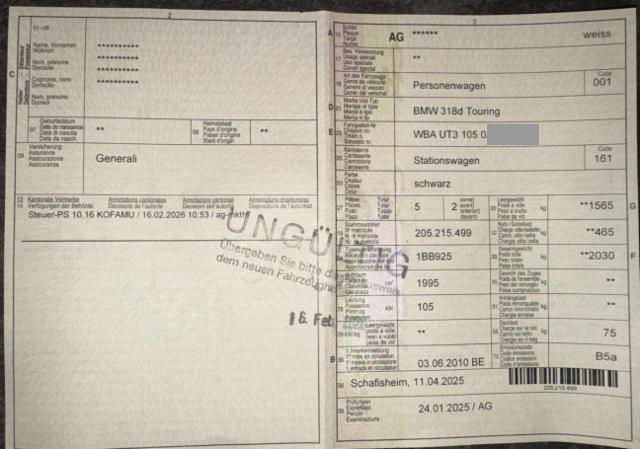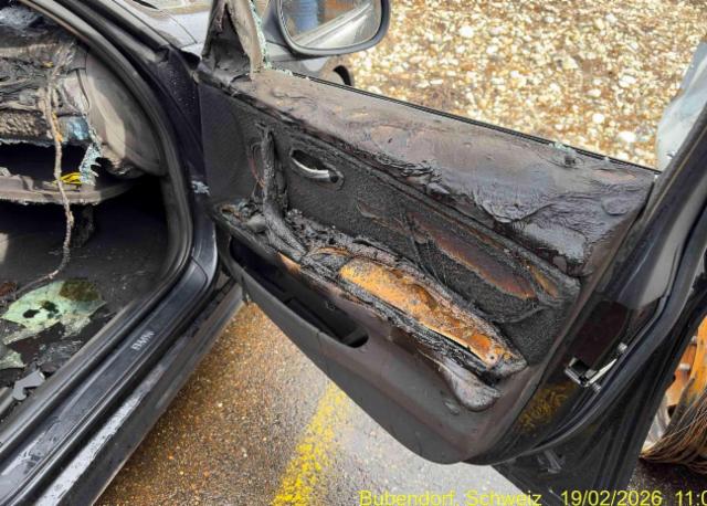 Wichtige HinweiseDemontagePersönliche Gegenstände oder Ladegut im Fahrzeug werden entfernt. Zustand Fahrzeug muss transportiert werden [Höhe und Breite beachten]. Fahrzeug ist NICHT fahrbar. Fahrzeug ist NICHT rollbar. Fahrzeug ist teilweise ausgebrannt. Fahrzeug weist äusserlich Brandspuren auf. Fahrzeug weist im Innenraum Brandspuren auf. Motor startet nicht, Ursache unbekannt. Batterie leer. Bereifung Fahrzeug wird mit Winterräder abgegeben. Sonstiges Fahrzeugdokumente vorhanden. Schlüssel Nur ein Schlüssel vorhanden. Hersteller- und Gewährleistungsbedingungen Die Fahrzeuggarantie oder Gewährleistung wird möglicherweise nicht vom Hersteller fortgeführt Weitere wichtige Hinweise Gemäss Reparateur wurde paar Tage vorher der Partikelfilter und das AGR ersetzt. Fr. 3000.00. Das Fahrzeug stand in einem Haus das abgebrannt war.Die [vom Fahrzeugsachverständigen] berechneten/geschätzten Reparaturkosten beziehen sich auf das aktuell begutachtete Ereignis. Allfällige zusätzliche, nicht versicherte Schäden/Vorschäden, sind in den Reparaturkosten nicht enthalten. Die deklarierten Ausstattungsmerkmale können von der effektiven Ausstattung abweichen. Wichtige HinweiseEs wurden keine technischen Kontrollen durchgeführt.Allfällige Garantieleistungen seitens Hersteller/Importeur können mit dem Schadenereignis hinfällig sein. Der effektive km Stand kann von dem abgelesenen/angegebenen km Stand abweichen. Weitere Details des Schadens sind auf den folgenden Fotos zu entnehmen. BeschädigungenLinks Linke Seite beschädigt. Rechts Rechte Seite beschädigt. Front Front links eingedrückt. Front rechts eingedrückt. Kotflügel vorne rechts eingedrückt. Kotflügel vorne links eingedrückt. Kotflügel vorne rechts und links eingedrückt. Motorhaube eingedrückt. Frontblech/Maskenblech eingedrückt. Heck Heck eingedrückt. Heck links eingedrückt. Heck rechts eingedrückt. Seitenwand hinten rechts eingedrückt/aufgestaucht. Seitenwand hinten links eingedrückt/ausgestaucht. Seitenwand hinten rechts und links eingedrückt. Heckblech eingedrückt. Kofferboden eingedrückt. Heckklappe eingedrückt. Abgasanlage deformiert. Motor Risiko Motor. Risiko Getriebe. Risiko Differenzial. Motoranbauteile beschädigt. Öl-/Kraftstoffaustritt vorhanden Achse Vorderachse ist beschädigt. Aufhängungsteile vorne links beschädigt. Aufhängungsteile vorne rechts beschädigt. Risiko Vorderachse. Risiko Hinterachse. Hinterachse rechts beschädigt. Hinterachse links beschädigt. Hinterachse ist beschädigt. Lenkgetriebe ist beschädigt. Risiko Lenkung. Motoraufhängung/Aggregateträger ist beschädigt. Elektrik Risiko Steuergeräte. Beschädigungen Kabelstränge verbrannt, beschädigt, abgerissen. Risiko Scheinwerfer. Risiko Nebellampen. Risiko Tagfahrleuchten. Innenraum Armaturenbrett ist beschädigt. Dachhimmel gerissen. Innenraum ungepflegt. Sitz vorne links defekt. Sitz vorne rechts defekt. Sitzpolster haben Brandlöcher. Starke Verschmutzung im Innenraum. Unangenehme Geruchsentwicklung im Innenraum [z.B. Treibstoff, Lebensmittel, Rauch, etc.] Raucher-Fahrzeug Glas Windschutzscheibe ist gerissen. Heckscheibe ist zerbrochen / beschädigt. Türscheibe vorne rechts ist zerbrochen / beschädigt. Türscheibe vorne links ist zerbrochen / beschädigt. Türscheibe hinten rechts ist zerbrochen / beschädigt. Türscheibe hinten links ist zerbrochen / beschädigt. Seitenscheibe hinten rechts ist zerbrochen / beschädigt. Seitenscheibe hinten links ist zerbrochen / beschädigt. Dach Dach eingedrückt. Dach ist vorne rechts eingedrückt. Dach ist vorne links eingedrückt. Dach ist hinten rechts eingedrückt. Dach ist hinten links eingedrückt. Schiebedach/Aufstelldach defekt. Unterboden Bodengruppe verzogen/beschädigt. Unterboden stark verschmutzt. Sonstige Schäden Div.Carrosserie Teile sind leicht beschädigt. Div. Roststellen am Fahrzeug. Lackierung matt [stumpf, beschädigt]. AusstattungSerienaustattung Klimaanlage inkl. Mikrofilter Seitenairbag für Fahrer und Beifahrer Elektronische Wegfahrsperre Radio BMW Business CD Velours-Fussmatten vorn und hinten Aussenspiegel elektrisch verstellbar und heizbar Gepäckraum-Trennnetz Check-Control Bordcomputer Wärmeschutzglas grün Seite 3 von www.swisscrashcars.ch 23.02.2026 10.29 6 Auktion Nr. 332771 Swiss Crash Cars Ausstattung Nebelscheinwerfer vorne Dynamische Stabilitäts-Control DSC Antiblockiersystem ABS Servolenkung Cornering Brake Control CBC Lederlenkrad Fahrer und Beifahrer-Airbag Mittelarmlehne im Fond Uni-Lackierung Multifunktions-Lenkrad Fensterheber elektrisch vorne + hinten Kopfairbags vorne + hinten Zentralverriegelung mit Fernbedienung Dynamische Traktions-Control DTC Dieselpartikelfilter Lenksäule mit Höhen- und Längseinstellung Vordersitze manuell verstellbar Rücksitzlehne asymmetrisch geteilt umklappbar Heckscheibe aufklappbar Sitzbelegungserkennung für Beifahrerairbag Kindersitzbefestigung Isofix für Fondsitze Radschraubensicherung Interieurleisten Satinsilber matt Auto Start Stopp Funktion Keine Gewähr auf die Angaben der Serienausstattungen SonderausstattungKlimaautomatik inkl. Mikrofilter Sport-Lederlenkrad Innenspiegel automatisch abblendbar Geschwindigkeitsregelung Sonnenschutzverglasung Metallic-Lackierung Spracheingabesystem Navigationssystem Professional Sportsitze für Fahrer und Beifahrer Vorbereitung für Universal Handy/ Bluetooth Pack Licht Park Distance Control PDC vorn und hinten Regensensor und automatische Fahrlichtsteuerung Armauflage vorn verschiebbar USB-Audio-Schnittstelle Leichtmetallräder V-Speiche 285 Stoff/Leder-Kombination Impuls Bereifung mit Notlaufeigenschaft Dachreling schwarz Ausstattung Klimaanlage Leichtmetall-Felgen Tempomat Metallic-Lackierung Seite 4 von www.swisscrashcars.ch 23.02.2026 10.29 6 Auktion Nr. 332771 Swiss Crash Cars |