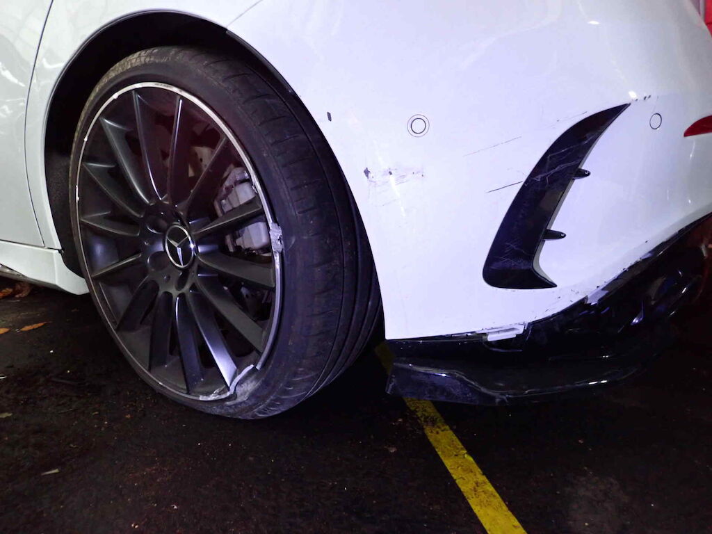 Kollision über Randstein in ein Geländer - weitere Schäden an Aufhänungsteilen können nicht ausgeschlossen werden.
