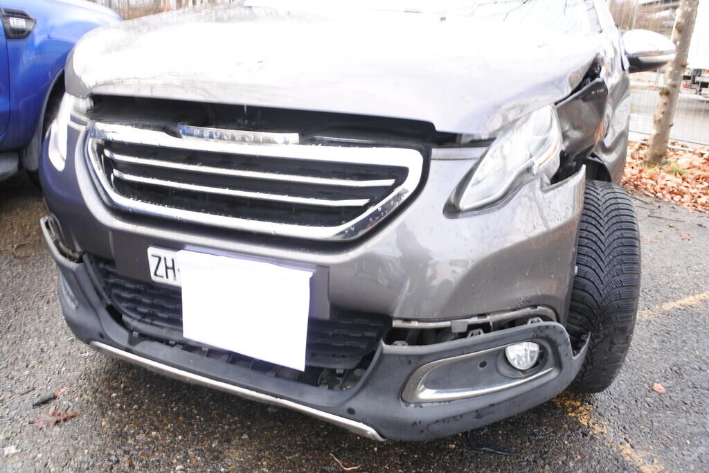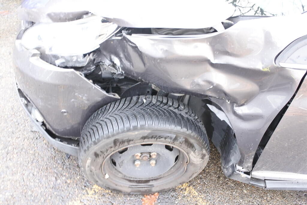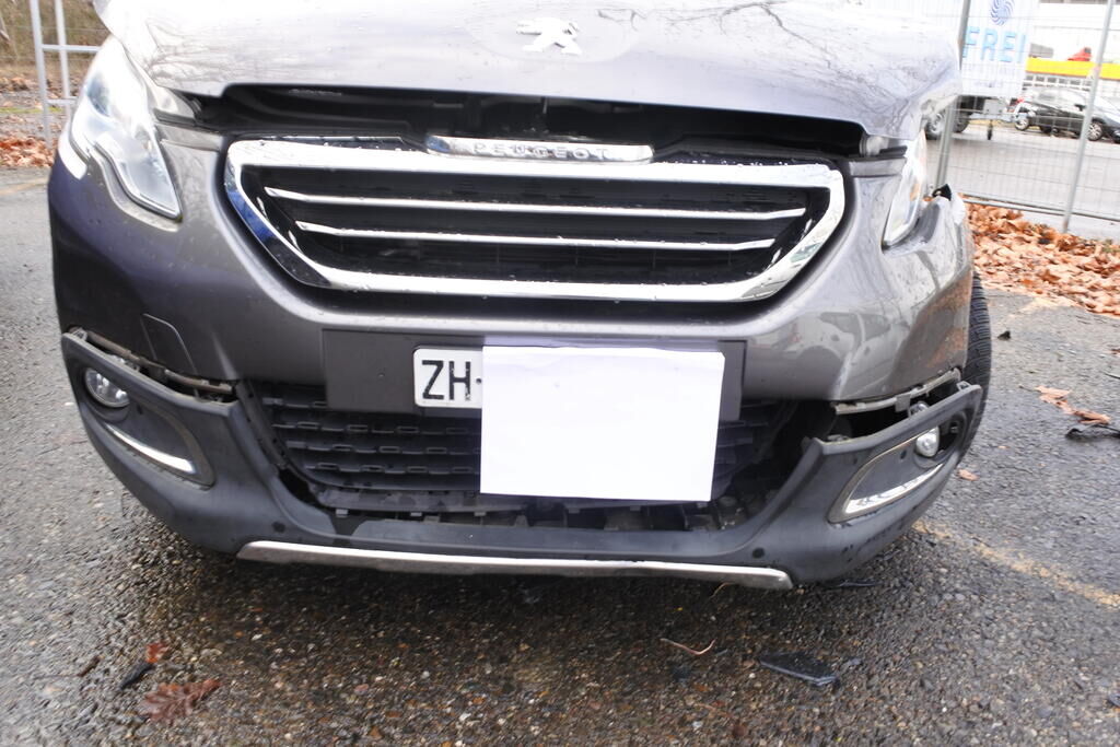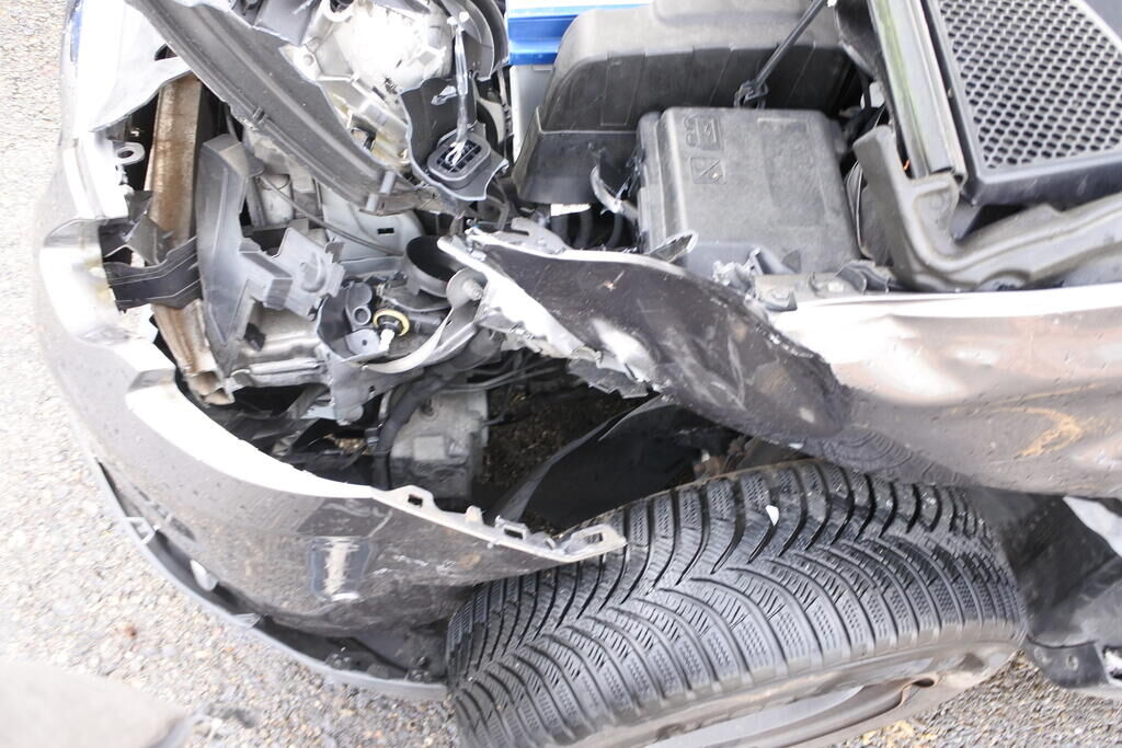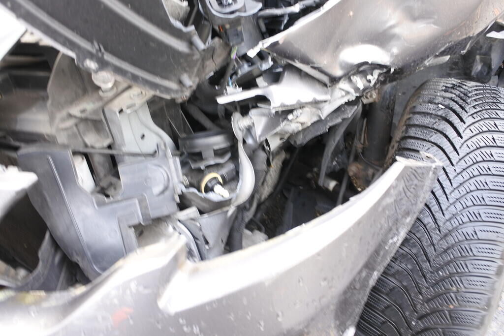 Die Stossstange mit Anbau-Zier-Verstärkungs-und befestigungsteilen, der Scheinwerfer mit Brillenblech, die Motorhaube mit Scharnieren, der Kotflügel mit Auskleidung und Befestigungen, das Radhaus sowie die Spritzwand im Bereich der A-Seule inkl. der Felge und deren Aufhängung sind beschädigt. Der Wagenvorderbau ist nach rechts verschoben, Der Seiten - und Kopfairbag sowie der Gurtenstraffer links wurden ausgelöst.