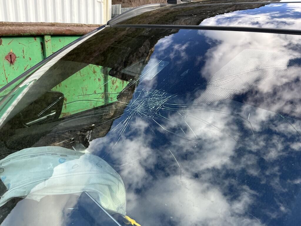 Projecteur droit, pare-chocs avant, pompe de lave glace, réservoir de lave glace et pare-brise cassés.