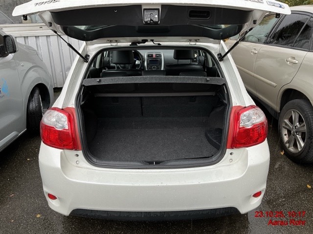 Armlehne vorne mit Ablagefach, Lenkrad: Lenkrad längs- und höhenverstellbar, Airbag: Airbag Fahrer und Beifahrer, Sitze: Rücksitzlehne geteilt abklappbar, Cupholder vorne, Heckspoiler, Innenlicht-Abschaltverzögerung, Gurtstraffer vorne, Ablagefach unter dem Beifahrersitz, Sitze: Sportsitze vorne, Katalysator geregelt, Licht: Drittes Bremslicht, Leuchtweitenregulierung von innen, Tankdeckel-Entriegelung von innen, Seitenaufprall-Schutzsystem, Assist: Rückfahrkamera, Beide Make up-Spiegel beleuchtet, 3-Punkt-Sicherheitsgurte auf allen Plätzen, Heckscheibenheizung, Berganfahrhilfe (Hill Holder), Media: USB+AUX-Anschluss, Getönte Scheiben, Elektrische Fensterheber vorne + hinten, Airbag: Seitenairbag für Fahrer und Beifahrer, ISOFIX Kindersitzvorrichtung, Stossstangen, Aussenspiegel und Türgriff in Wagenfarbe, Licht: LED-Tagfahrlicht, Airbag: Airbag Beifahrer deaktivierbar, Airbag: Window-Kopfairbags, Aluminium-Applikationen, Innenspiegel automatisch abblendbar, Sitze: Vordersitze heizbar, Getriebe: Stufenloser Automat, Aussenspiegel rechts und links beheizbar und elektrisch verstellbar, Servolenkung geschwindigkeitsabhängig, Radiovorbereitung, Dachantenne und, Laderaumabdeckung, Leseleuchten, Lackierung: Uni-Lackierung, Assist: Tempomat, Stabilitäts- und Traktionskontrolle (VSC und TRC), Drehzahlmesser, Sitze: Fahrersitz höhenverstellbar, Smart Entry-/Start-System, Media: Multimedia Audiosystem Toyota Touch, 3 Kopfstützen hinten, Wegfahrsperre elektronisch, Digital Uhr, Licht: Nebelscheinwerfer, Airbag: Knie-Airbag für Fahrer, Mittelarmlehne vorne, Media: Bluetooth-Schnittstelle, Regen- und Dämmerungssensor, Klima: Klimatisierungsautomatik, Tageskilometerzähler, Handschuhfach, Radiofernbedienung, Wassertemperaturanzeige, Scheibenwischer vorne mit Intervall, Sitze mit Schleudertrauma-Schutzsystem, Höhenverstellbare Gurten vorne, Heckscheiben-Wisch-/Waschanlage, Pollenfilter (Staubfilter), Mittelkonsole mit Ablagefach, Media: 6 Lautsprecher, Aussentemperaturanzeige, Antiblockiersystem (ABS), Polster: Stoff-Ausstattung, Licht: Nebelschlussleuchte, Multifunktionsanzeige, Räder: Leichtmetallfelgen 17J mit Pneu, Räder: Reifenreparatur-Set (Tire Fit), Info-Display, Bremsassistent (BAS), Lenkrad: Lederlenkrad