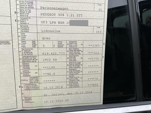 Wichtige HinweiseZustandFahrzeug ist fahrbar. Sonstiges Fahrzeugdokumente vorhanden. BeschädigungenRechts Rechte Seite beschädigt. Anstoss rechts im Bereich der A-Säule. Anstoss rechts im Bereich der B-Säule. Anstoss rechts im Bereich der C-Säule. Achse Aufhängungsteile vorne rechts beschädigt. Weitere Beschädigungen Gebrauchsspuren Stossfänger AusstattungSerienaustattung Airbag Fahrer und Beifahrerseite Elektrische Fensterheber vorne + hinten Aussenspiegel elektrisch verstellbar und heizbar Servolenkung Seitenairbag Fahrer und Beifahrerseite Nebelscheinwerfer Zentralverriegelung mit Fernbedienung Höhenverstellbare Vordersitze Lederlenkrad Lenkrad verstellbar Kopfairbag vorne und hinten Leichtmetallfelgen 16" Deaktivierung Beifahrerairbag Aussenspiegel elektrisch anklappbar ESP/ ASR Lendenwirbelstütze Fahrersitz Rücksitze geteilt umklappbar ABS und EBV Elektr. Bremskraftverteilung inkl. BA Pack Visibilité Zwei Zonen-Klimaautomatik Mittelarmlehne vorne mit Staufach Kindersitzverankerung ISOFIX hinten Sitzbezüge in Stoff/ Kunstleder Head-Up Display Reifendruck-Sensoren RDS Berganfahrhilfe Elektrische Parkbremse Einparkhilfe hinten 230 V Steckdose Touchscreen-Bildschirm Stop + Start System Einparkhilfe vorne USB-Anschluss Bluetooth Freisprecheinrichtung Peugeot Connect SOS/ Assistance Geschwindigkeitsregler und - begrenzer programmierbar Keine Gewähr auf die Angaben der Serienausstattungen Pack Confort Verkehrsschild-Erkennungssystem Apple Car Play/ Android Auto Navigationssystem/ Peugeot Connect Garantie 3 Jahre/ 80'000 km Pack Safety SonderausstattungMetallic-Lackierung Leichtmetallfelgen 16"+ Notrad Digitaler Radioempfang DAB+ Parkassistent/ Toter-Winkel-Assistent Ausstattung Sommerräder MIT Stahl-Felgen. Sonstige Ausstattung und Zubehör 8 fach Räder |