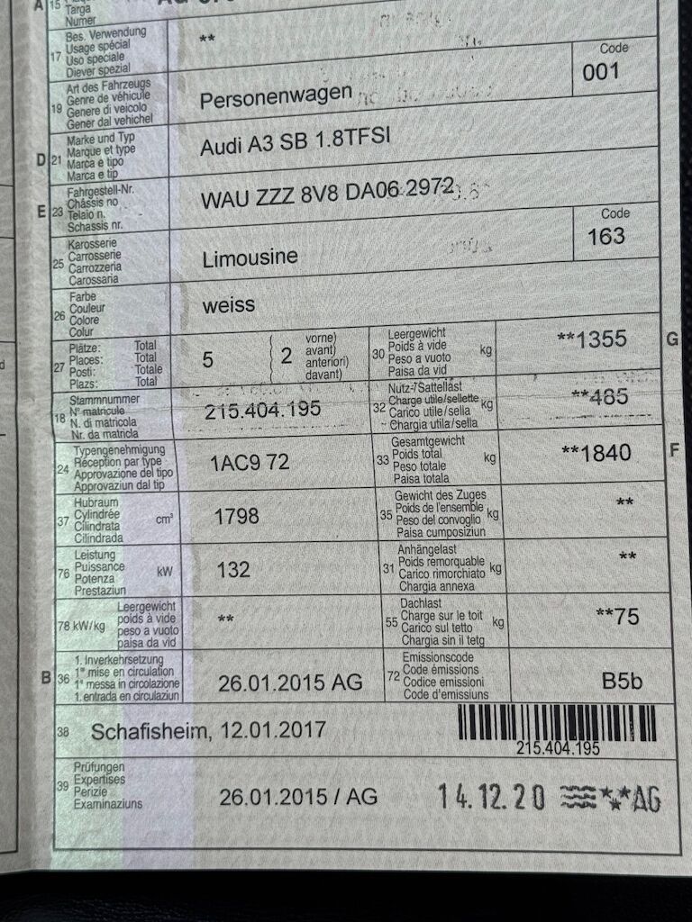 | Keine technische Prüfung (Werkstatttest) vorgenommen Diverse Schäden an Karosserie/Lack. 8-fach bereift mit Felgen. Zwei Schlüssel. Fahrzeug ab Platz, ohne Garantie und Aufbereitung. Fahrzeug ist für Export Alle Service wurden beim Audi-Händler durchgeführt. Bremsen hinten demnächst fällig. Frontscheibe hat einen Kratzer. Ölverbrauch, 1L auf 1300Km. Reifen und Bremsen vorne sind gut. | |