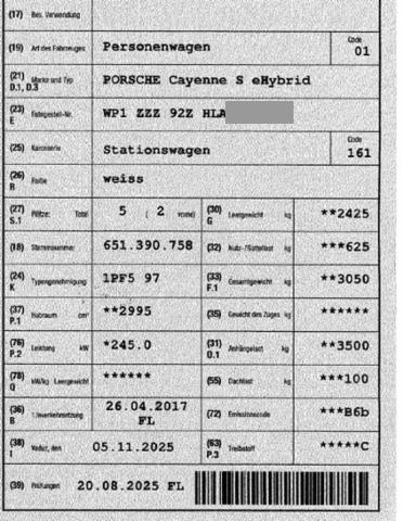 | VIN | WP1ZZZ92ZHL****** | Reifenprofil in %: | |