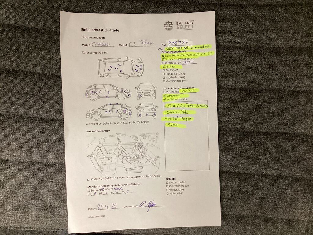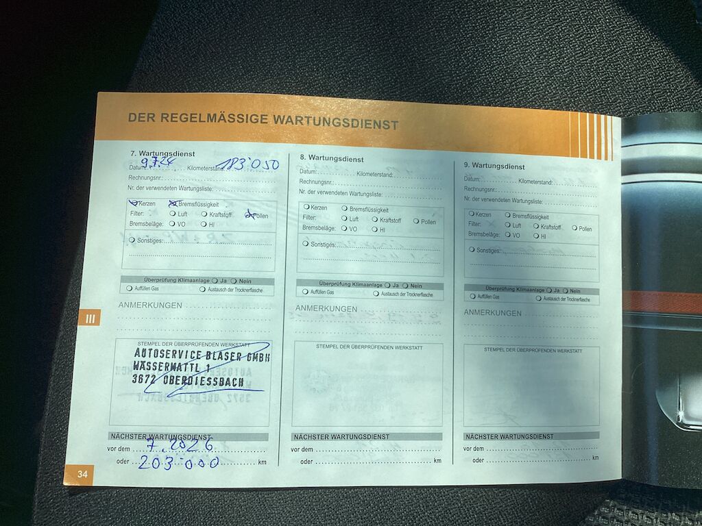 | MFK siehe Foto Ausweis Service Foto Kratzer Fz hat Hagel Fz wird ca. bei Hereinnahme Datum 202300KM haben | |