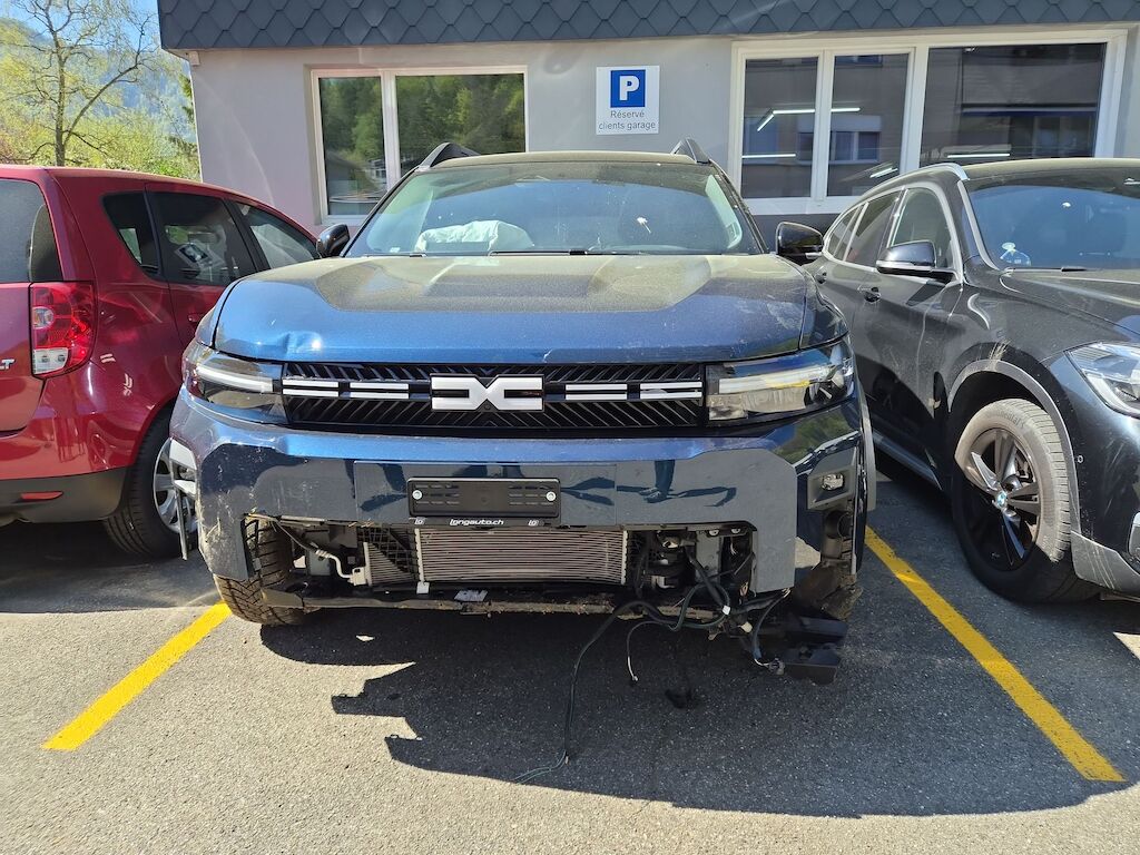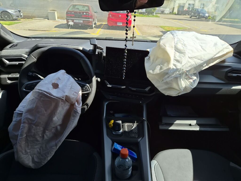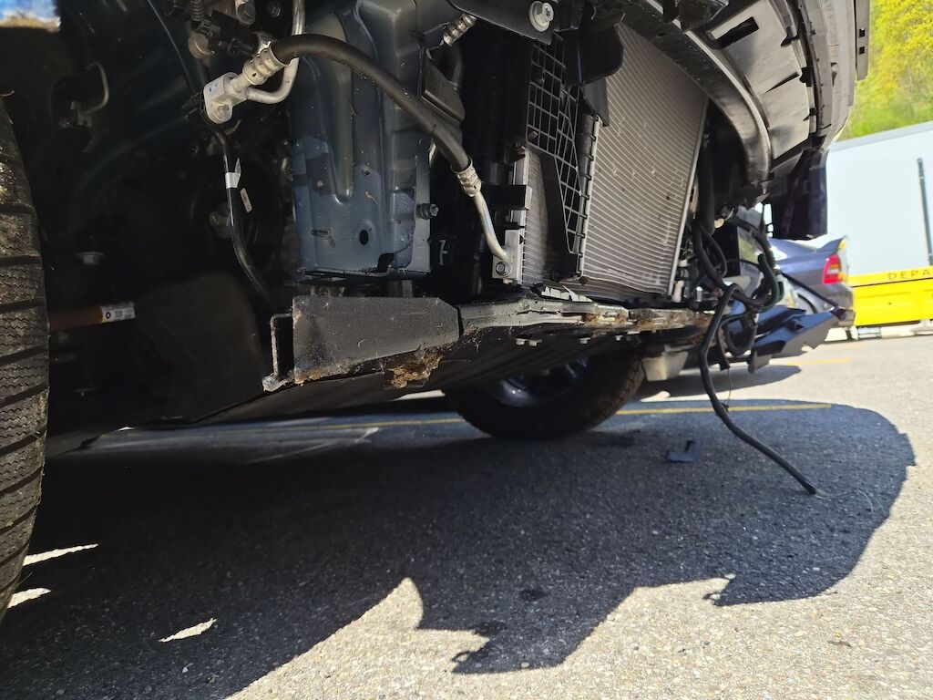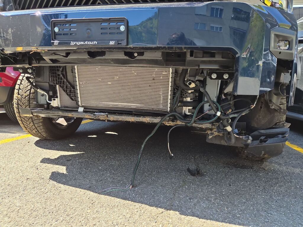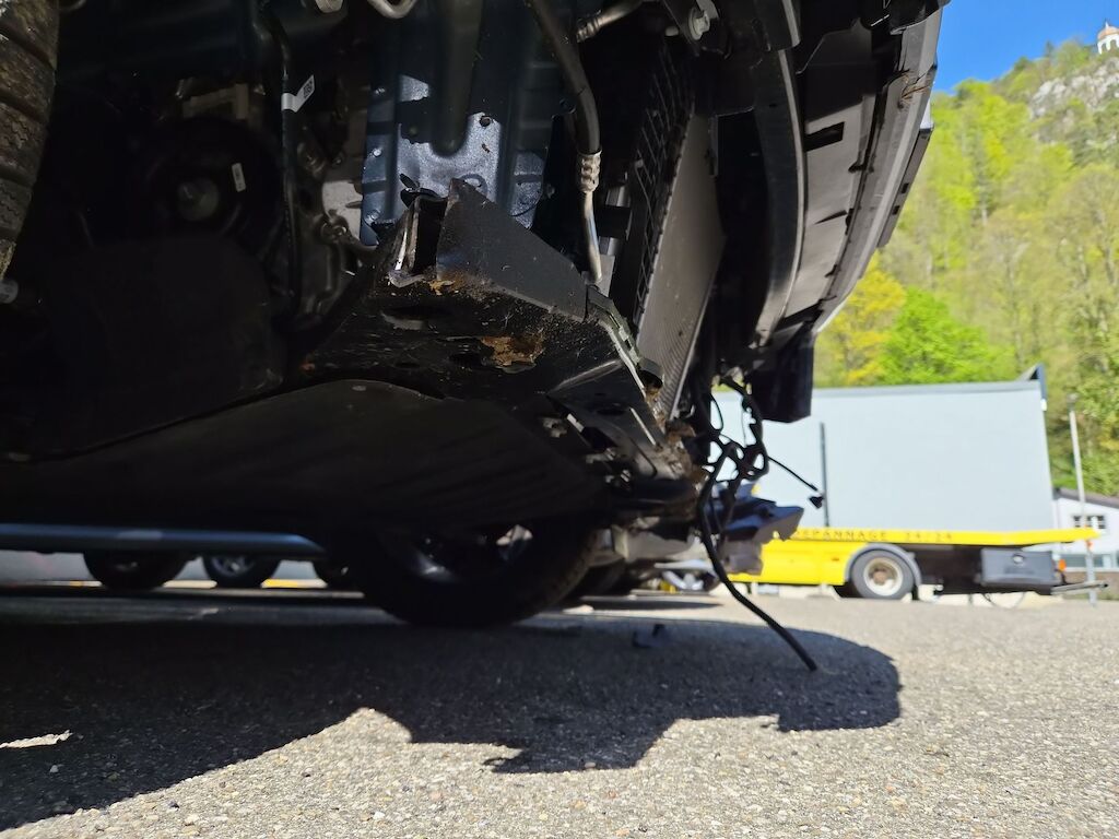 Impact à l'avant du véhicule avec dommages au pare-chocs, radiateurs, tableau de bord et divers composants.