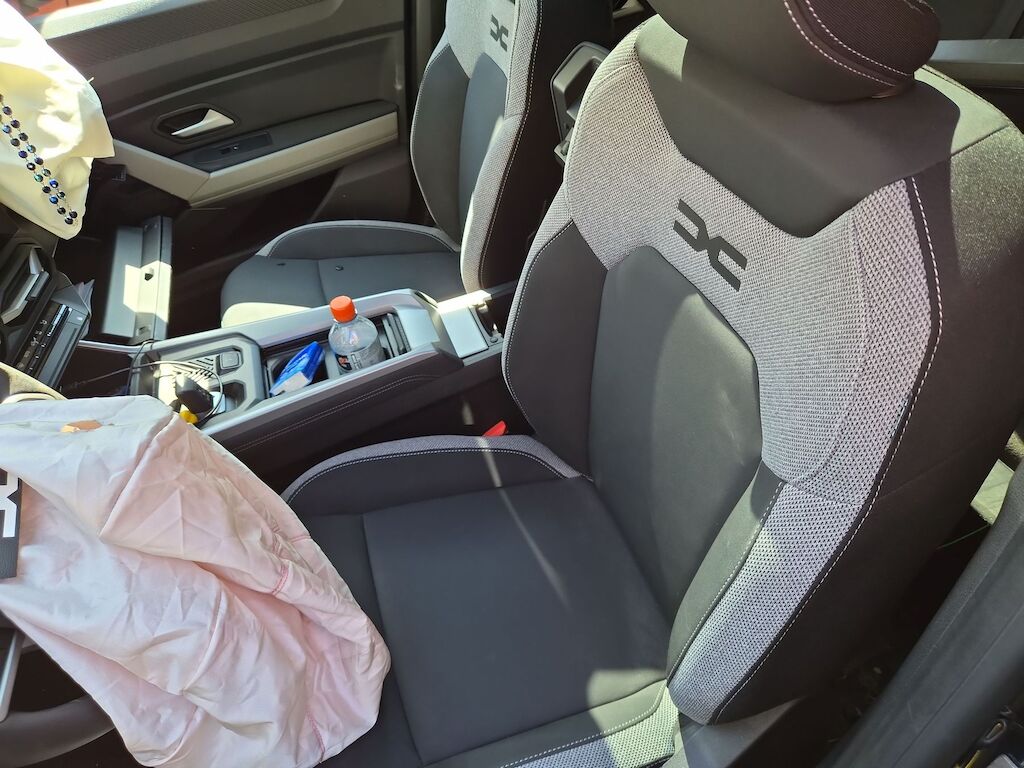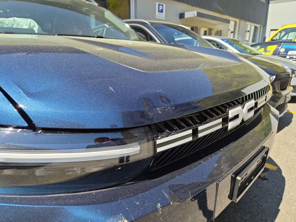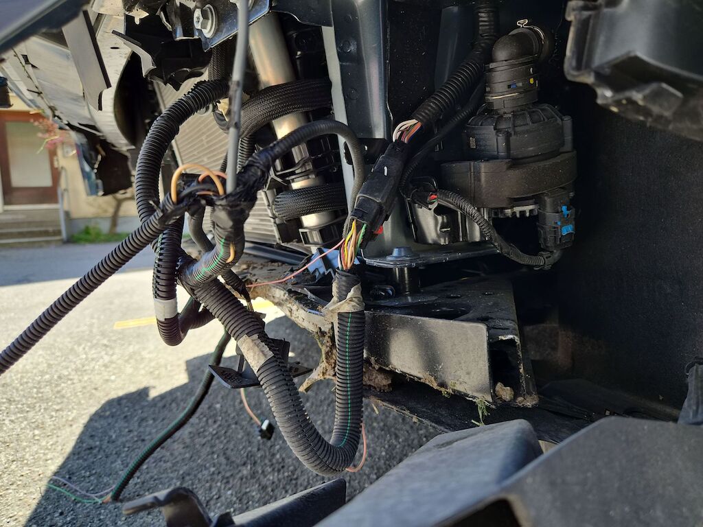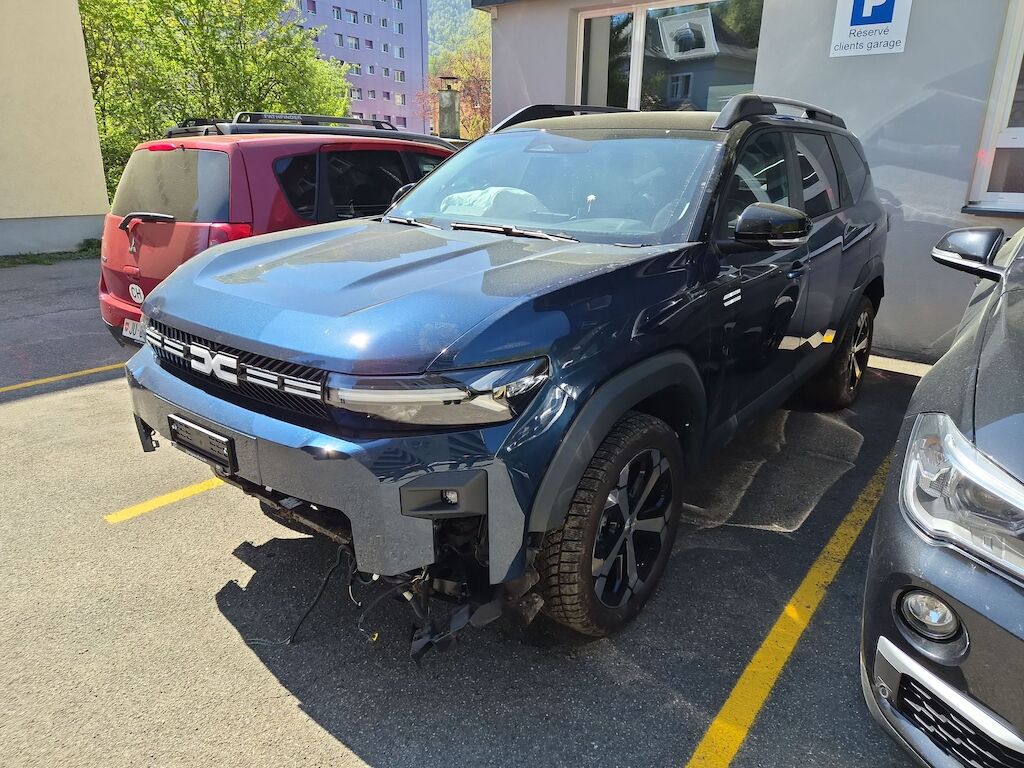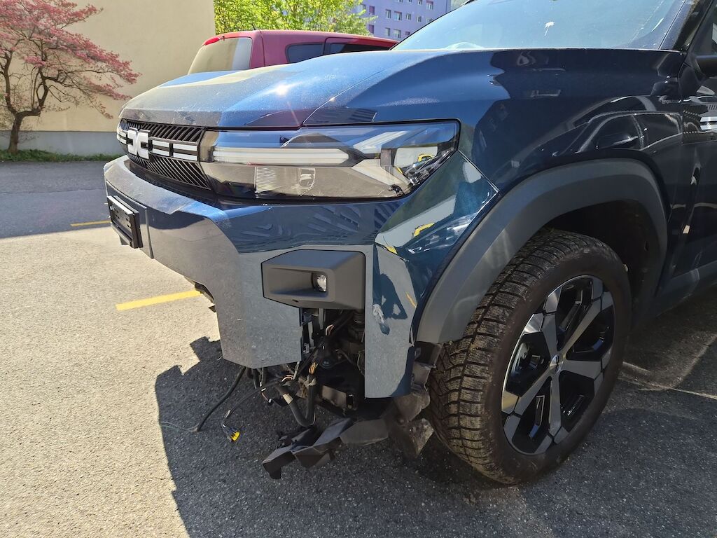 Impact à l'avant du véhicule avec dommages au pare-chocs, radiateurs, tableau de bord et divers composants.
