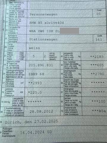 Wichtige HinweiseDemontagePersönliche Gegenstände oder Ladegut im Fahrzeug werden entfernt. Zustand Fahrzeug muss transportiert werden [Höhe und Breite beachten]. Fahrzeug ist fahrbar. Fahrzeug ist rollbar. Batterie leer. Bereifung Fahrzeug wird mit Sommerräder abgegeben. Sonstiges Fahrzeugdokumente vorhanden. BeschädigungenFront Front rechts eingedrückt. Frontblech/Maskenblech eingedrückt. Fahrzeugvorbau verschoben. Motor Motorstörung: Warnleuchte aktiv Elektrik Risiko Steuergeräte. Sonstige Schäden Div.Carrosserie Teile sind leicht beschädigt. Weitere Beschädigungen Beschädigungen Kühlerpaket Risiko. Antriebswelle vorn rechts aussen ausgeschlagen [Klopfgeräusche]. Blende am Innenhimmel vorn mittig abgefallen. AusstattungSerienaustattung Fahrer und Beifahrer-Airbag Seitenairbag für Fahrer und Beifahrer Elektronische Wegfahrsperre Aussenspiegel elektrisch verstellbar und heizbar Innen- und Aussenspiegel automatisch abblendbar Gepäckraum-Trennnetz Aussentemperaturanzeige Bordcomputer Nebelscheinwerfer vorne Dynamische Stabilitäts-Control DSC Antiblockiersystem ABS Servotronic Kindersitzbefestigung Isofix Cornering Brake Control CBC Hill Descent Control HDC Lederlenkrad 12 V Steckdose Lenkrad verstellbar Velours-Fussmatten Exterieurumfänge in Wagenfarbe Regensensor und automatische Fahrlichtsicherung Uni-Lackierung Multifunktions-Lenkrad Radio/ CD BMW Professional Fensterheber elektrisch vorne + hinten Kopfairbags vorne + hinten Park Distance Control PDC vorn und hinten Zentralverriegelung mit Fernbedienung Dynamische Traktions-Control DTC Dieselpartikelfilter Geschwindigkeitsregelung mit Bremsfunktion Rücksitzlehne asymmetrisch geteilt umklappbar Teilelektrische Sitzverstellung Fahrer und Beifahrer Deaktivierung Beifahrerairbag Klimaautomat 2-Zonen inkl. Mikrofilter Elektrische Parkbremse Gepäckraumabdeckung herausnehmbar Interieurleisten Satinsilber matt Keine Gewähr auf die Angaben der Serienausstattungen Pack Swiss-Premium SonderausstattungDiebstahlwarnanlage Lordosenstütze für Fahrer und Beifahrer Sitzheizung für Fahrer und Beifahrer Skisack Automatische Heckklappenbetätigung Sonnenschutzverglasung Niveauregulierung für die Hinterachse Sportliche Fahrwerksabstimmung Pack Ablage Dachhimmel anthrazit M-Lederlenkrad Navigationssystem Professional HiFi-Lautsprechersystem Vorbereitung für Universal Handy/ Bluetooth Adaptives Kurvenlicht Integrierte Universal-Fernbedienung Komfortzugang Aktivlenkung Panorama-Glasdach Head-Up Display Fernlichtassistent Leder Nevada Adaptives Befestigungssystem USB-Audio-Schnittstelle Spurverlassenswarnung Leichtmetallräder V-Speiche 223/ Mischbereifung Pack M Sport Dachreling Shadow Line Aluminium Line Exterieur M Exterieurumfänge in Wagenfarbe Komfortsitze elektrisch verstellbar mit Memory/ vorn Side View Kameras Erweiterte Anbindung des Music-Players im Mobiltelefon Rückfahrkamera mit Top View Speed Limit Info Apps |
