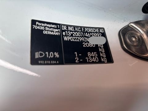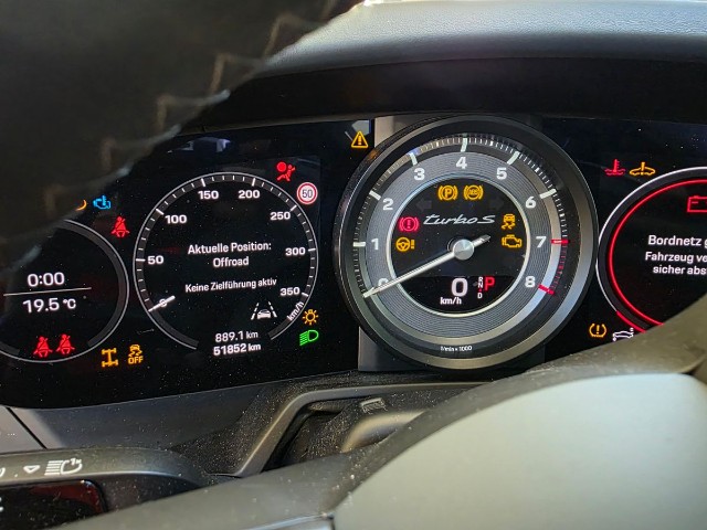 Wichtige HinweiseZustandMotor startet nicht, Ursache unbekannt. Batterie leer. BeschädigungenLinks Linke Seite beschädigt. Rechts Rechte Seite beschädigt. Motor Risiko Motor. Turbolader beschädigt. Achse Risiko Vorderachse. Risiko Hinterachse. Risiko Lenkung. Innenraum Gurtstraffer ausgelöst. Glas Heckscheibe ist zerbrochen / beschädigt. AusstattungSerienaustattung Airbag Fahrer und Beifahrerseite Elektronische Wegfahrsperre/ Alarmanlage Elektrische Fensterheber Aussenspiegel elektrisch verstellbar und heizbar Tempomat ABS Antiblockiersystem Seitenairbag Fahrer und Beifahrerseite ESP Elektronisches Stabilitätsprogramm Windschott Zentralverriegelung mit Fernbedienung Windowbag Sprachbedienungssystem Reifendruck-Kontrollsystem RDK Fussmatten Innen- u. Aussensp. autom. abblendbar/ Regensensor Aussenspiegel elektrisch anklappbar Bose Surround Sound -System Variable Servolenkung Zwei Zonen-Klimaautomatik Handy Vorbereitung Ceramic Composite Brake CCB Lederausstattung zweifarbig Active Suspension Management PASM Park-Distanz-Sensor vorne + hinten/ Rückfahrkamera Pack Sport Chrono Porsche Dynamic Chassis Control PDCC Windschutzscheibe mit Graukeil Start + Stopp Funktion Multi-Informationsdisplay Pack Adaptive Sportsitze inkl. Komfort-Memory-Paket Details siehe gültige Preisliste des Importeurs Keine Gewähr auf die Angaben der Serienausstattungen Isofix-Kindersitzbefestigung Beifahrer Torque Vectoring Plus TV [Differentialsperre] DAB+ Digital Audio Broadcast Leichtmetallräder 20"/21" Connect Plus Hinterachslenkung GT Sportlenkrad Matrix LED-Scheinwerfer Porsche Communication Management PCM Ottopartikelfilter SonderausstattungFahrwerk 10 mm tiefergelegt Garagen-Toröffner HOME LINK Komfortzugang Burmester High-End Surround Sound -System Vordersitze belüftet Liftsystem Vorderachse Servolenkung Plus Pack Licht-Design Park-Distanz-Sensor v+h/ Rückfahrkamera/ Surround View Abstandsregeltempomat inkl. InnoDrive Schriftzug in Schwarz Sonstige Ausstattung und Zubehör PPF Folierung |