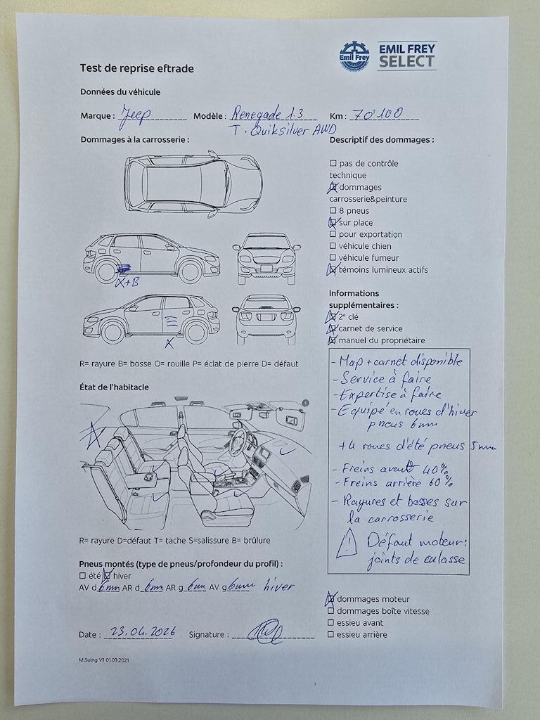 | 2 clés Map + carnet d'entretien disponible Service à faire Expertise à faire Equipé en roues d'hiver pneus 6 mm + 4 roues d'été disponible pneus 6 mm Freins avant 40% Freins arrière 60 % Maque le couvre-coffre Rayures et bosses sur la carrosserie - voir les photos Témoin moteur actif : joint de culasses à changer 2 keys Owner's manual + service history available Servicing required MFK inspection due Fitted with winter wheels and 6 mm tyres + 4 summer wheels available with 6 mm tyres Front brakes 40% Rear brakes 60% Boot cover missing Scratches and dents on the bodywork – see photos Engine warning light on: cylinder head gasket needs replacing | |