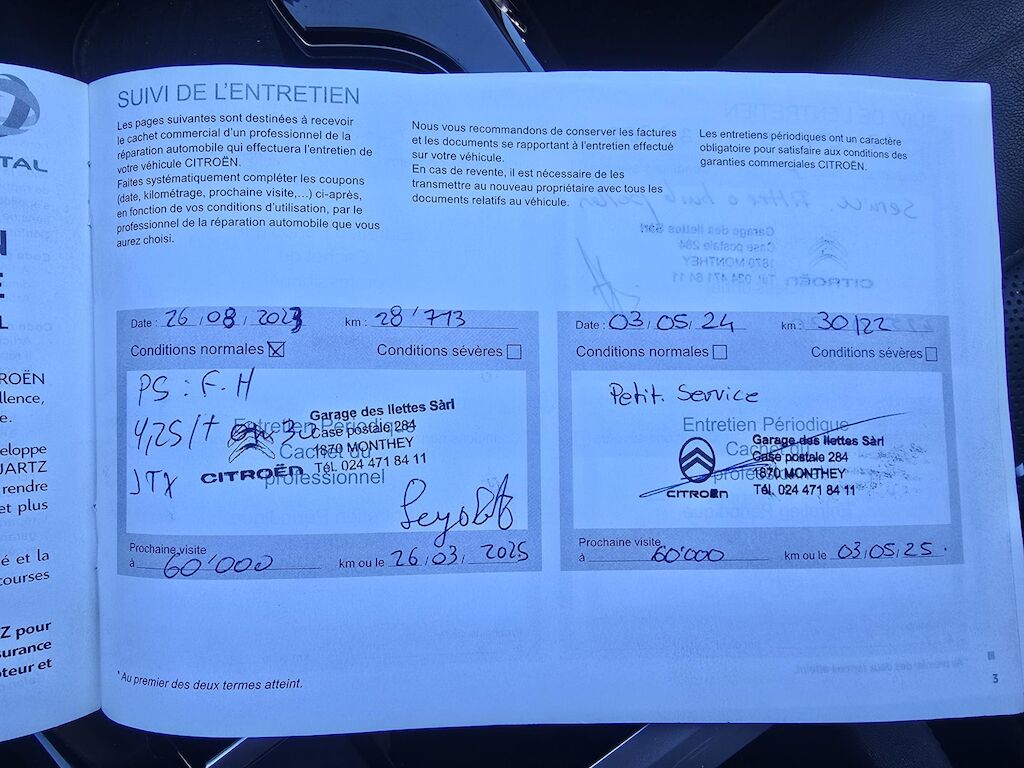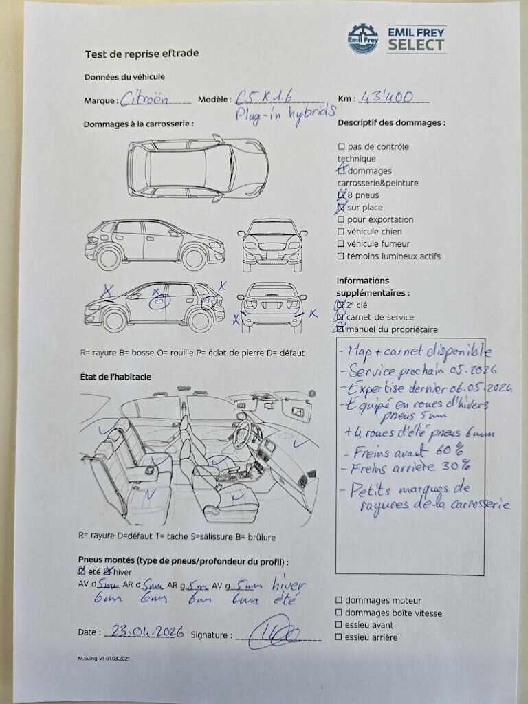 | 2 clés Map + carnet de service disponible Service prochain 05.2026 Expertise dernier 06.05.2024 Equipé en roues d'hiver pneus 5 mm + 4 roues d'été pneus 6 mm Freins avant 60% Freins arriè 30 % Petits marques de rayures sur la carrosserie Pas de contrôle technique (essai en aroute) effectué 2 keys MOT certificate and service history available Next service due 05/2026 Last MFK 06.05.2024 Fitted with winter tyres 5 mm + 4 summer tyres 6 mm Front brakes 60% Rear brakes 30 % Minor scratches on the bodywork No workshop inspection (road test only) carried out | |