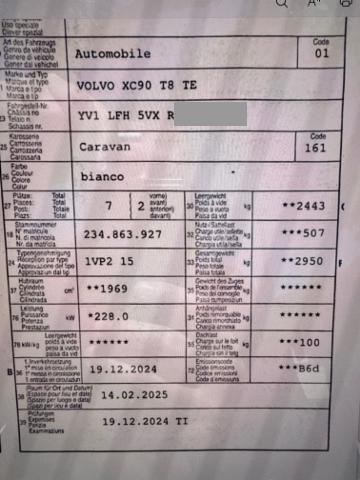 Wichtige HinweiseZustandMotor startet nicht, Ursache unbekannt. Weitere wichtige Hinweise Fahrzeug im Notfall Berechnung bei montiertem Fahrzeug, eventuelle Aufschläge BeschädigungenWeitere Beschädigungen Gefährdete Längsträger AusstattungSerienaustattung Airbag Fahrer und Beifahrerseite Sitzheizung vorne + hinten Elektrische Fensterheber vorne + hinten Aussenspiegel elektrisch verstellbar und heizbar Metallic-Lackierung Dachreling EDS Elektronische Differentialsperre Zentralverriegelung mit Fernbedienung Innen- und Aussenspiegel automatisch abblendbar Lenkrad verstellbar SIPS Kopf-/ Schulterairbag Gepäckraum-Trennnetz Standheizung mit Timer Abgedunkelte Seitenscheiben und Heckscheibe Textilfussmatten Sonnenschutzrollo für Seitenfenster hinten Bremsassistent EBA Isofix-Kindersitzbefestigung Rückfahrkamera Vordersitze elektrisch verstellbar mit Memory Keyless-Drive Aussenspiegel elektrisch anklappbar inkl. Bodenleuchten Laderaumrollo WHIPS Schleudertrauma-Schutzsystem Mittelarmlehne h mit Getränkehalter/ Staufach Regen- und Lichtsensor SIPS Seitenairbag Fahrer und Beifahrerseite Elektrische Kindersicherung Alarmanlage mit Innenraumüberwachung/ Neigungssensor Knieairbag Fahrer BLIS Blind Spot Information System ABS und EBD Elektr. Bremskraftverteilung Head-Up Display Panorama-Schiebedach Adaptive Geschwindigkeitsregelung ACC Rücksitze geteilt umklappbar 40/20/40 Vier Zonen-Klimaautomatik Einparkhilfe vorne und hinten Heckklappe automatisches öffnen/ schliessen Reifendruck-Sensoren TPMS Lenkradheizung Start + Stopp Funktion LED Tagfahrlicht USB-Anschluss Spurhalteassistent LDW Ladekabel Keine Gewähr auf die Angaben der Serienausstattungen HDC Hill Descent Assist/ Bergabfahrassistent Fussgänger-Soundmodul Lichtpaket Innenraum DAS Driver Alert/ Assistenzsystem Vordersitze mit Massagefunktion DAB+ Digital Audio Broadcast Multifunktion für Lenkrad Digitale Instrumentierung 360° Kamera Audiosystem Bowers & Wilkins VSP Volvo Swiss Premium Verkehrsschild-Erkennungssystem City Safety inkl. Kreuzungsbremsassistent Leichtmetallräder 21" 8-Speichen Drive-Mode Wireless Charging für mobile Geräte LED-Scheinwerfer mit Fernlichtassist. + aktivem Kurvenlicht Adaptive Luftfederung/ Four-C-Technik Komfortsitze Nappaleder mit Ventilation ESC Fahrdynamikregelung Beinauflagen und Lendenwirbelstütze elektrisch einstellbar Armaturenbrett in Lederoptik Spurwechselwarnung Pack Light Pack Winter Garantie Batterie 8 Jahre/ 160'000 km Erweitertes Luftqualitätssystem Pack Digital Service SonderausstattungSonderlackierung Pack Charge Fleet |