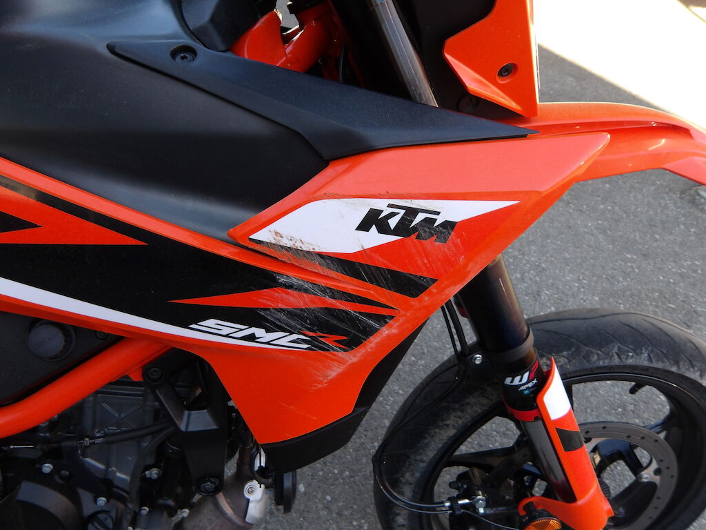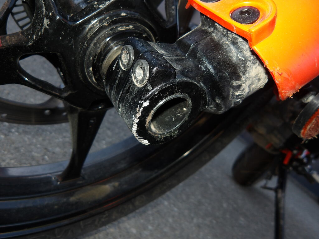 Flanc droit griffé = carénages avant et arrière griffés, guidon plié, embouts gauche et droit griffé, rétroviseurs gauche et droit cassés, support arrière passager griffé, clignoteurs cassé, spoiler avant et phare griffé, embout de fourche avant gauche griffé, pare-boue, béquille pliée, levier d'embrayage, de freins cassés, réservoir griffé (très léger).
