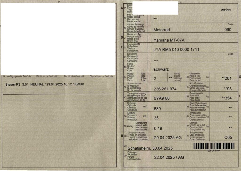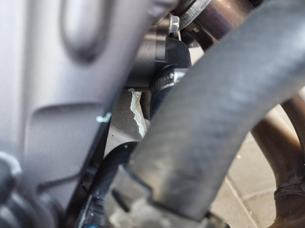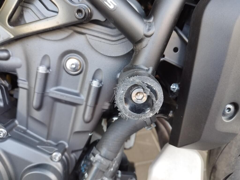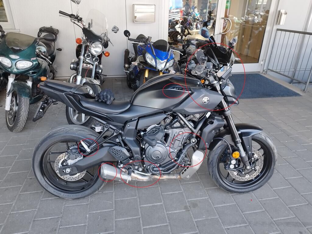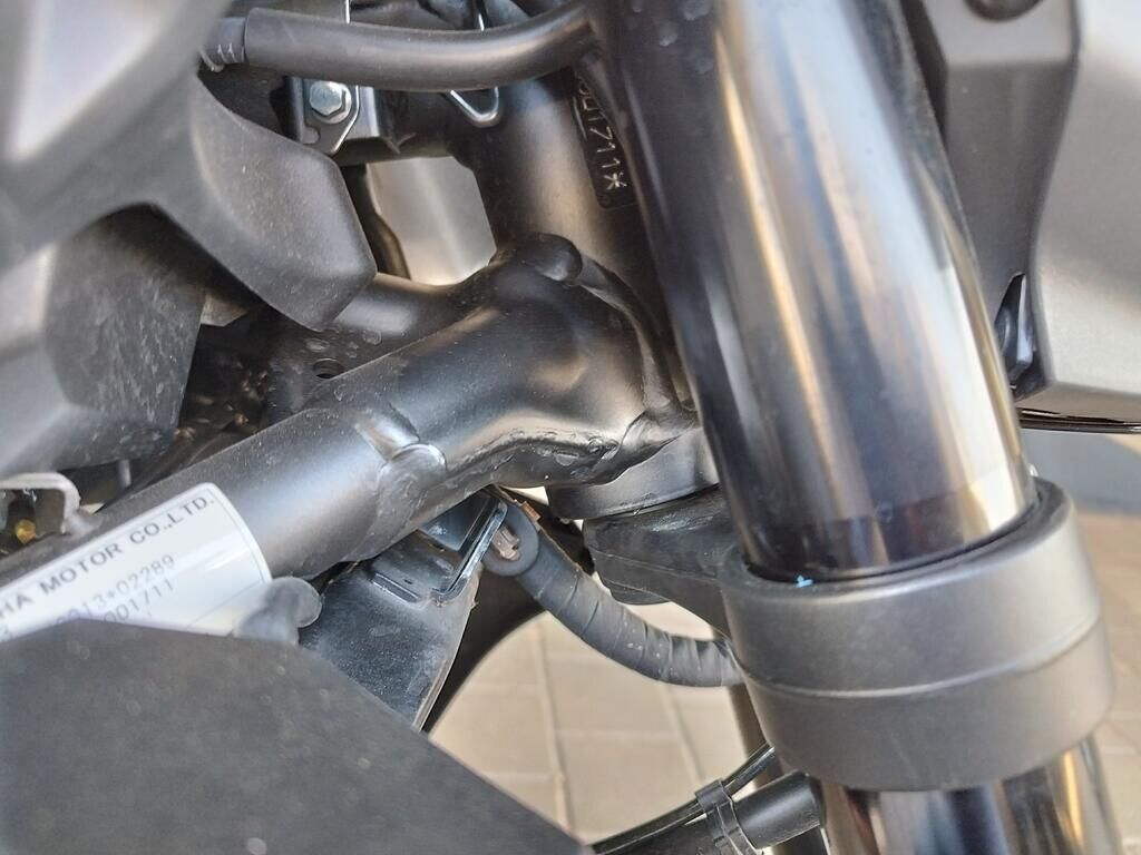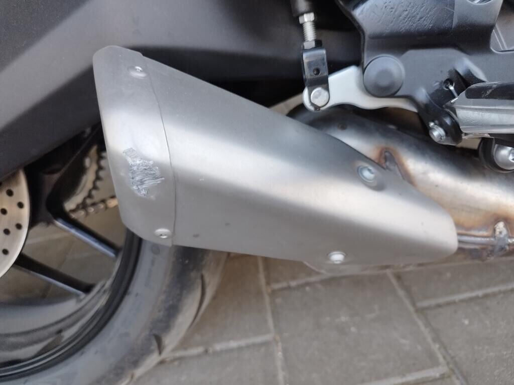 Die Gabel vorne ist gestaucht, der Lenker ist verbogen, der Rahmen ist deformiert und angerissen, der Bremshebel hat Kratzspuren, der Spiegel rechts hat Kratzspuren, die Verkleidung vorne rechts hat Kratzspuren, der Tank hat Kratzspuren, Motor hat Wasserverlust, das Sturzpad rechts hat Kratzspuren, das Bremspedal hat Kratzspuren, der Fussraster vorne rechts hat Kratzspuren, der Fussraster hinten rechts hat Kratzspuren, die Auspuffverkleidung hat Kratzspuren.