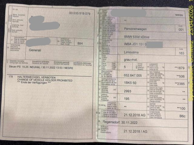 Wichtige HinweiseDemontagePersönliche Gegenstände oder Ladegut im Fahrzeug werden entfernt. Zustand Fahrzeug muss transportiert werden [Höhe und Breite beachten]. Fahrzeug ist NICHT fahrbar. Fahrzeug ist rollbar. Bereifung Fahrzeug wird mit Winterräder abgegeben. Sonstiges Fahrzeugdokumente vorhanden. Schlüssel Nur ein Schlüssel vorhanden. Hersteller- und Gewährleistungsbedingungen Die Fahrzeuggarantie oder Gewährleistung wird möglicherweise nicht vom Hersteller fortgeführt Weitere wichtige Hinweise Die [vom Fahrzeugsachverständigen] berechneten/geschätzten Reparaturkosten beziehen sich auf das aktuell begutachtete Ereignis. Allfällige zusätzliche, nicht versicherte Schäden/Vorschäden, sind in den Reparaturkosten nicht enthalten. Die deklarierten Ausstattungsmerkmale können von der effektiven Ausstattung abweichen. Es wurden keine technischen Kontrollen durchgeführt. Sie bieten auf ein beschädigtes Fahrzeug ohne technische Prüfung. Dieses "Angebot" ist nicht vergleichbar mit anderen Occasionsverkaufsplattformen. Allfällige Garantieleistungen seitens Hersteller/Importeur können mit dem Schadenereignis hinfällig sein. Der effektive km Stand kann von dem abgelesenen/angegebenen km Stand abweichen. Weitere Details des Schadens sind auf den folgenden Fotos zu entnehmen. Persönliche Gegenstände können durch den Halter entfernt werden. BeschädigungenRechts Rechte Seite beschädigt. Front Front rechts eingedrückt. Motor Risiko Getriebe. Risiko Differenzial. Achse Aufhängungsteile vorne rechts beschädigt. Risiko Vorderachse. Lenkgetriebe ist beschädigt. Risiko Lenkung. Sonstige Schäden Div.Carrosserie Teile sind leicht beschädigt. Weitere Beschädigungen Antriebswelle, Querlenker, Stossdämpfer deformiert, verkratzt AusstattungSerienaustattung Fahrer und Beifahrer-Airbag Diebstahlwarnanlage Seitenairbag für Fahrer und Beifahrer Radio BMW Professional Sport-Lederlenkrad Reifendruck-Kontrollsystem RDC Innenspiegel automatisch abblendbar Durchladesystem Armauflage vorn Dynamische Stabilitäts-Control DSC Antiblockiersystem ABS Servotronic Kindersitzbefestigung Isofix CD-Laufwerk Velours-Fussmatten Regensensor und automatische Fahrlichtsicherung Uni-Lackierung Navigationssystem Business Kopfairbags vorne + hinten Park Distance Control PDC vorn und hinten Dieselpartikelfilter Geschwindigkeitsregelung mit Bremsfunktion Digital audio DAB-Tuner Freisprecheinrichtung mit USB-Schnittstelle LED-Nebelscheinwerfer Keine Gewähr auf die Angaben der Serienausstattungen ConnectedDrive Services Remote Services LED-Scheinwerfer BMW Service Plus 10 Jahre/ 100'000 km Teleservice Pack Swiss-Premium Aufmerksamkeitsassistent SonderausstattungSitzheizung für Fahrer und Beifahrer Automatische Heckklappenbetätigung Sonnenschutzverglasung Metallic-Lackierung 12 V Steckdose Navigationssystem Professional Soft Close Automatic für Türen Scheinwerfer-Waschanlage Integrierte Universal-Fernbedienung Komfortzugang Head-Up Display Interieurleisten Aluminium Feinschliff Fernlichtassistent Klimaautomat 2-Zonen inkl. Mikrofilter BIN Dachhimmel anthrazit Harman/Kardon Surround Sound System Active Protection Adaptive LED-Scheinwerfer Multifunktionales Instrumentendisplay Telefonie mit Wireless Charging Display Schlüssel Gestiksteuerung WLAN Hotspot Komfortsitze elektrisch verstellbar vorne Vorbereitung Apple Car Play Leichtmetallräder V-Speiche 684 Parking Assistant Plus Driving Assistant Plus Ausstattung Klimaanlage Leichtmetall-Felgen Rückfahrsensoren Metallic-Lackierung |