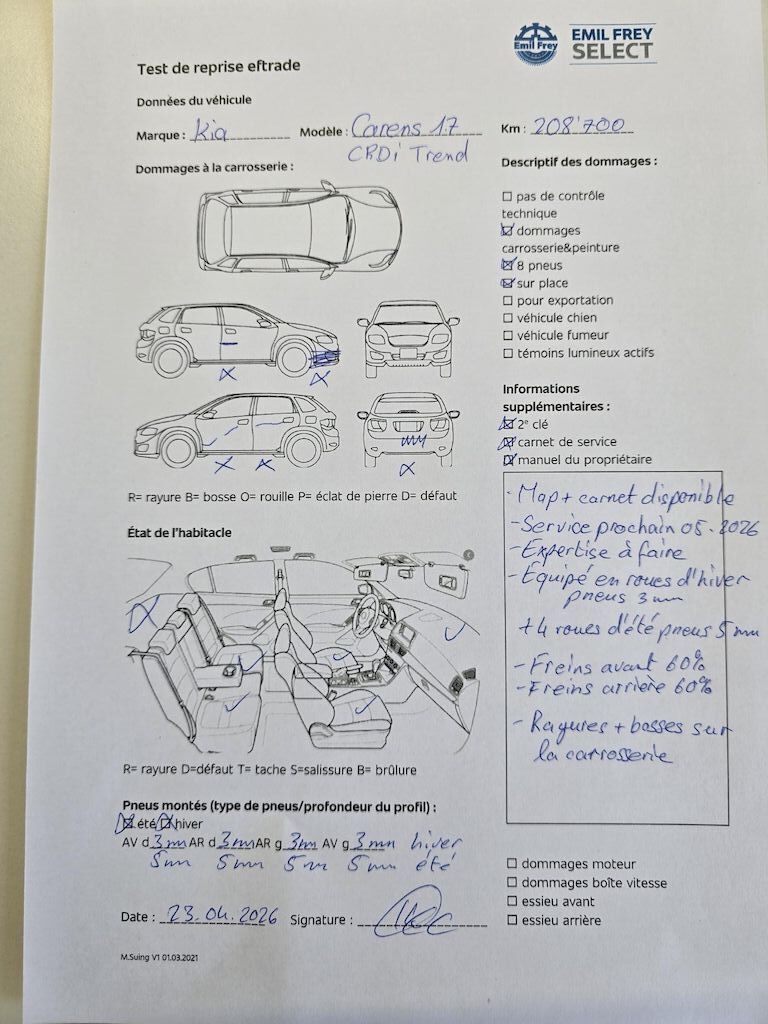 | 2 clés Map + carnet de service disponible Service prochain 05.2026 Expertise à faire Equipé en roues d'hiver pneus 3 mm + 4 roues d'été pneus 5 mm Freins avant 60 % Freins arrière 60% Siège conducteur déchiré Rayures et bosses sur la carrosserie Pas de contrôle technique (essai en route) effectué | |