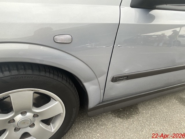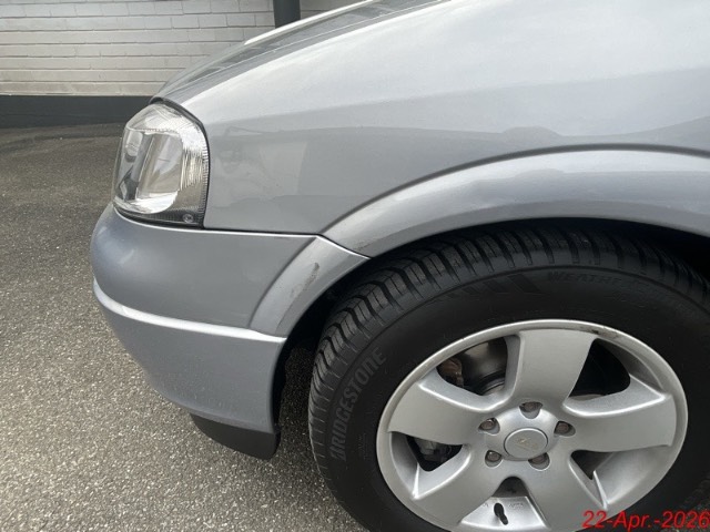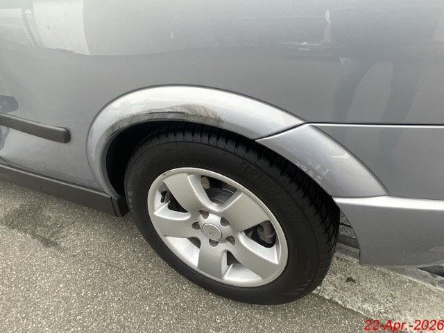 Seite links: Die Seitentüre, der Kotflügel und die Seitenwand sind deformiert mit Kratzer. Die Stossstange vorne, die Felge haben Kratzer. / Vorbestandene Schäden: Gebrauchsspuren