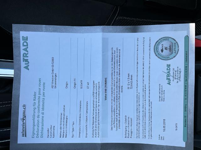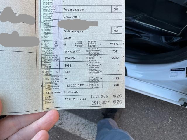 Wichtige HinweiseSchlüsselNur ein Schlüssel vorhanden. Kategorie Das Fahrzeug wird vom Besitzer noch benutzt. BeschädigungenHeck Heckblech eingedrückt. Abgasanlage deformiert. Sonstige Schäden Div.Carrosserie Teile sind leicht beschädigt. AusstattungSerienaustattung Airbag Fahrer und Beifahrerseite Elektrische Fensterheber vorne + hinten Aussenspiegel elektrisch verstellbar und heizbar Tempomat Zentralverriegelung mit Fernbedienung Innenspiegel automatisch abblendbar SIPS Kopf-/ Schulterairbag Multifunktionslenkrad Regensensor ABS und EBV Elektr. Bremskraftverteilung Lederschalthebel Leder-Handbremshebel Textilfussmatten Bremsassistent EBA Aussenspiegel elektrisch anklappbar inkl. Bodenleuchten Make-up-Spiegel beleuchtet DSTC Fahrdynamikregelung WHIPS Schleudertrauma-Schutzsystem Audiosystem Performance Radio/ CD SIPS Seitenairbag Fahrer und Beifahrerseite Knieairbag Fahrer Dieselpartikelfilter Fahrersitz höhenverstellbar Klimaautomatik Beifahrersitz höhenverstellbar Polsterung Textil/ T-Tec Stop + Start System Luftraumheizer elektrisch/ Schnellenteisung Rücksitze umklappbar 60/40 Lederlenkrad mit Aluminiumdekor Lendenwirbelstütze Fahrersitz verstellbar Keine Gewähr auf die Angaben der Serienausstattungen Fussgänger-Airbag VSP Volvo Swiss Premium SonderausstattungSitzheizung vorne Heizbare Frontscheibe Standheizung mit Timer Abgedunkelte Seitenscheiben und Heckscheibe Scheinwerferwaschdüsen Bi-Xenon-Scheinwerfer/ aktives Kurvenlicht Aktivkohlefilter mit automatischer Umluftschaltung Einparkhilfe hinten Pack Volvo On-Call VOC/Telematiksystem Ladeboden variabel/ Kofferraum Innenraumbeleuchtung/ zusätzlich Klimaautomatik/ Handschuhfach gekühlt Keyless Start InfoTS Sensus Connect mit High Performance Sound Navigationssystem Sensus Connect Sonstige Ausstattung und Zubehör Sommerräder |