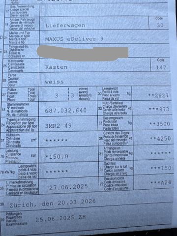 Wichtige HinweiseDemontagePersönliche Gegenstände oder Ladegut im Fahrzeug werden entfernt. Zustand Fahrzeug ist fahrbar. Sonstiges Fahrzeugdokumente vorhanden. Weitere wichtige Hinweise Ladekabel vorhanden Das Fahrzeug ist teilweise Foliert BeschädigungenRechts Rechte Seite beschädigt. Anstoss rechts im Bereich der D-Säule. Heck Heck rechts eingedrückt. Seitenwand hinten rechts eingedrückt/aufgestaucht. Elektrik Risiko Steuergeräte. AusstattungSerienaustattung Klimaautomat Airbag Fahrer und Beifahrerseite Zentralverriegelung Elektrische Fensterheber Aussenspiegel elektrisch verstellbar und beheizbar Servolenkung Nebelscheinwerfer Lenkrad verstellbar Rückfahrkamera Leichtmetallfelgen 16" Schiebetüre rechts verblecht ABS + Bremsassistent Seiten- und Kopfairbag vorn Beifahrer Doppelsitzbank Multifunktionslenkrad Licht und Regensensor Garantie 5 Jahre/ 100'000 km Bordcomputer Heckdoppelflügeltüren 255° Berganfahrassistent Reifendruckkontrolle Fahrersitz 6-fach verstellbar/ Armlehne Parksensor vorne und hinten Ersatzrad ESP + Hill Holder USB Anschluss Details siehe gültige Preisliste des Importeurs Keine Gewähr auf die Angaben der Serienausstattungen Ladekabel Sitzheizung Laderaumbeleuchtung LED DAB+ [Digitaler Radioempfang] Spurhalteassistent Totwinkel-Assistent Radio/ MP3/ Bluetooth LED Tagfahrlicht Lenkrad beheizbar LED-Scheinwerfer Touchscreen Adaptiver Tempomat ACC Apple CarPlay & Android Auto Keyless Zugang/ Starten Automatische Notbremsung Spurverlassenswarnung eCall Garantie Batterie 8 Jahre/ 250'000 km |