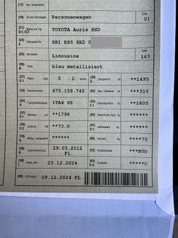 Wichtige HinweiseZustandFahrzeug ist fahrbar. BeschädigungenSonstige Schäden Div.Carrosserie Teile sind leicht beschädigt. AusstattungSerienaustattung Klimaautomat Airbag Fahrer und Beifahrerseite Elektronische Wegfahrsperre Sitzheizung vorne Elektrische Fensterheber vorne + hinten Tempomat Seitenairbag Fahrer und Beifahrerseite Nebelscheinwerfer Zentralverriegelung mit Fernbedienung Höhenverstellbarer Fahrersitz manuell Lederlenkrad Mittelarmlehne vorne Innenspiegel automatisch abblendbar Lenkrad verstellbar Kopfairbag vorne und hinten Scheibenwischer mit Regensensor Deaktivierung Beifahrerairbag Aussenspiegel elektrisch verstellbar/ heizbar und anklappbar Audiofernbedienung am Lenkrad Stabilitätskontrolle VSC + Traktionskontrolle TRC Leichtmetallräder 17" Servolenkung geschwindigkeitsabhängig Knieairbag Fahrer Isofix-Kindersitzbefestigung hinten Rücksitzlehnen getrennt abklappbar 60:40 Radio/ CD Scheinwerfer mit automatischer Ein- Ausschaltfunktion Smart entry-start/ Schliess- Startsystem Anschluss USB und AUX Reifen-Reparatur Set ABS und EBD Elektr. Bremskraftverteilung inkl. BA Bluetooth Freisprecheinrichtung Innenspiegel mit integriertem Rückfahrmonitor Keine Gewähr auf die Angaben der Serienausstattungen SonderausstattungMetallic- oder Mica Lackierung |