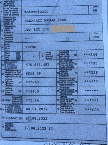 JKAEX250KKD******Wichtige HinweiseZustandFahrzeug ist rollbar. Kategorie Fahrzeug nach Diebstahl aufgefunden. Zweirad-Kategorie Motorrad Weitere wichtige Hinweise Das Motorrad konnte nicht gestartet werden, da die Kabel am Zündschloss durchtrennt wurde. BeschädigungenAusstattung |