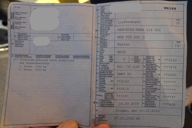 Wichtige HinweiseZustandFahrzeug ist fahrbar. Fahrzeug ist rollbar. Bereifung Fahrzeug wird mit Winterräder abgegeben. Kategorie Das Fahrzeug wird vom Besitzer noch benutzt. BeschädigungenHeck Heck eingedrückt. Heckblech eingedrückt. Heckklappe eingedrückt. Weitere Beschädigungen Diverse Schäden, siehe Fotos. AusstattungSerienaustattung Airbag Fahrerseite Elektrische Fensterheber vorne Aussenspiegel elektrisch verstellbar und beheizbar Servolenkung Schiebetüre rechts Elektronische Wegfahrsperre Zentralverriegelung mit Fernbedienung Lenkrad verstellbar ESP Elektronisches Stabilitätsprogramm Holzboden im Laderaum Dieselpartikelfilter Wärmeschutzverglasung Elektronische Bremskraftverteilung EBV ABS + ASR Handschuhfach abschliessbar Warmluft-Zusatzheizung elektrisch Komfort-Fahrersitz Beifahrersitz Zweisitzer Laderaum-Verkleidung/ Hartfaser Blue EFFICIENCY Keine Gewähr auf die Angaben der Serienausstattungen Radio Audio 10 SonderausstattungLaderaum-Innenverkleidung bis Dachhöhe Breite Trittstufe an Flügeltür hinten Flügeltüren hinten 270° |