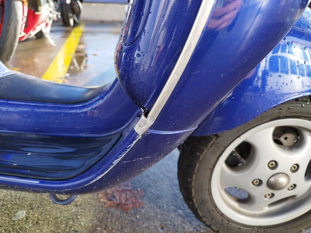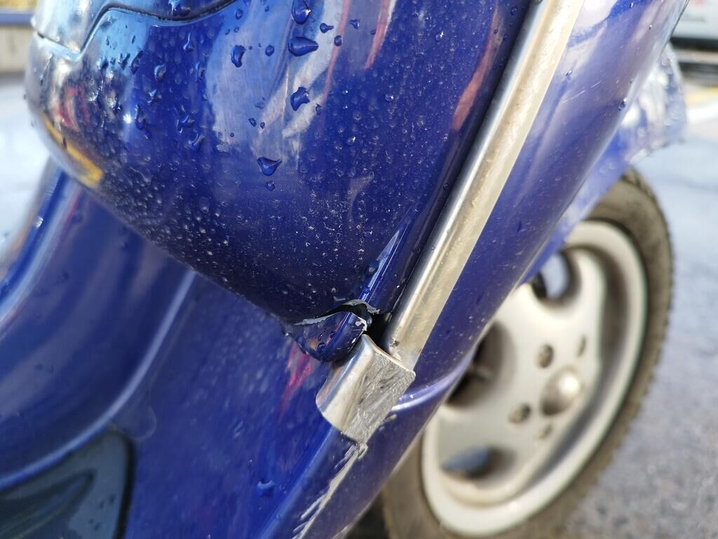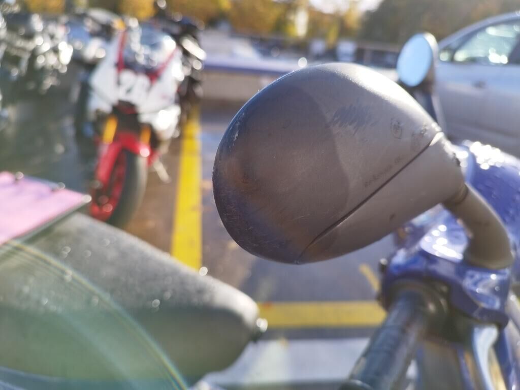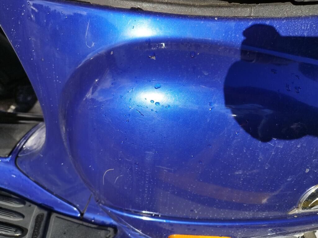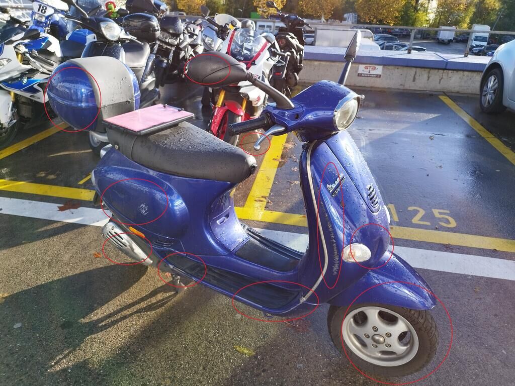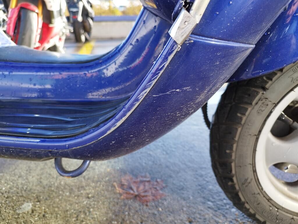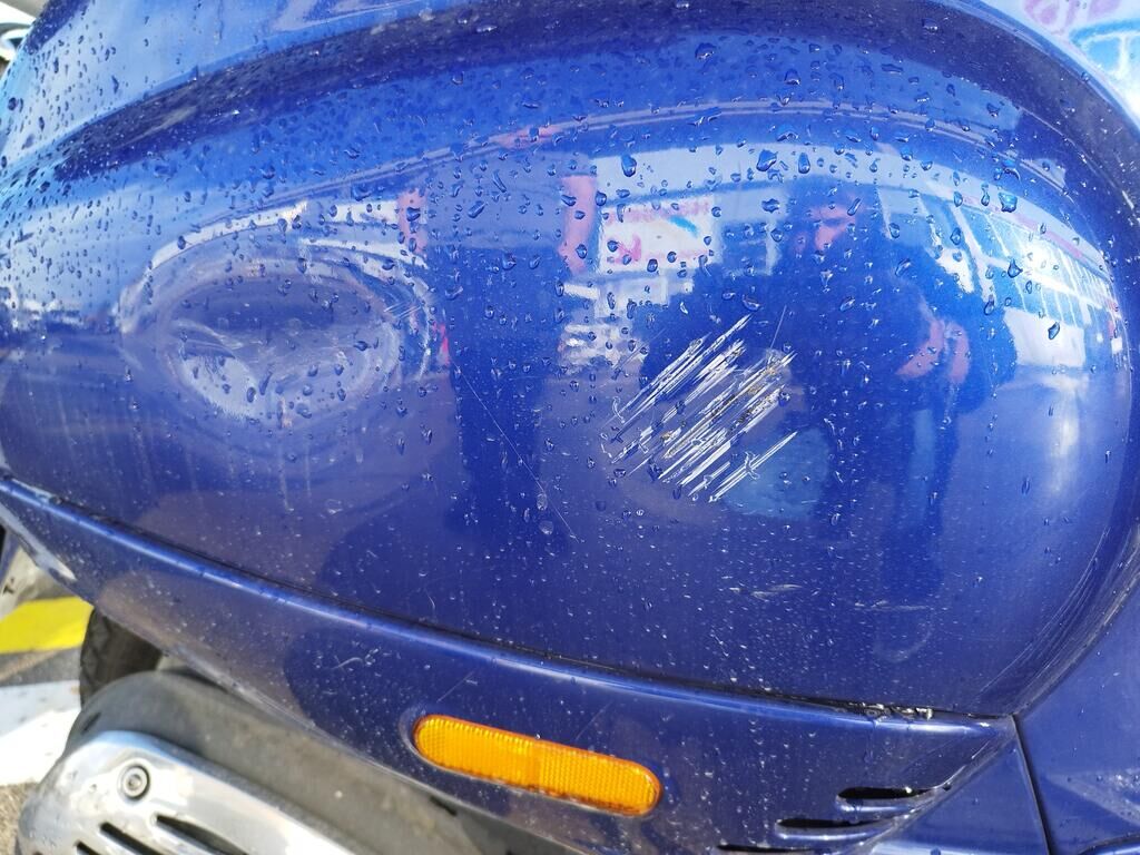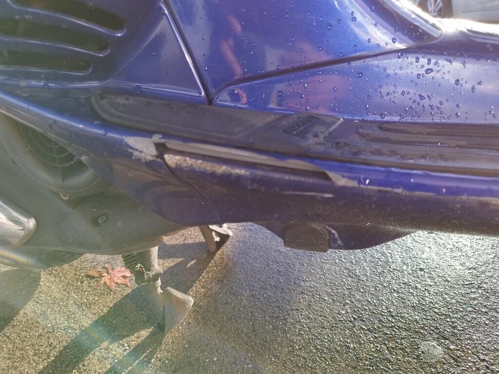 Der Lenker ist schräg, das Rad vorne steht schräg, der Kotflügel vorne hat Kratzspuren, der Rahmen vorne hat eine Delle und Kratzspuren, der Bremshebel rechts hat Kratzspuren, der Spiegel rechts hat Kratzspuren, die Chromleiste rechts hat Kratzspuren, das Trittbrett rechts hat Kratzspuren und ist gerissen, der Rahmen hinten rechts hat Kratzspuren und eine Delle, das Hitzeschild hat Kratzspuren, das Top Case hat Kratzspuren.