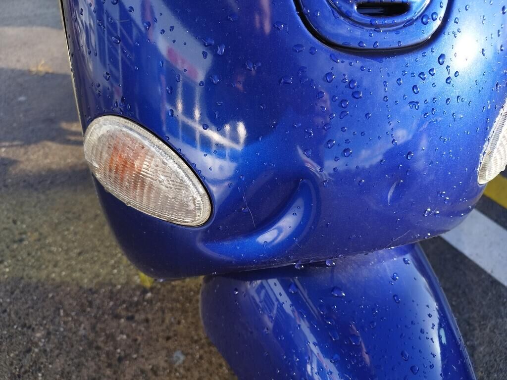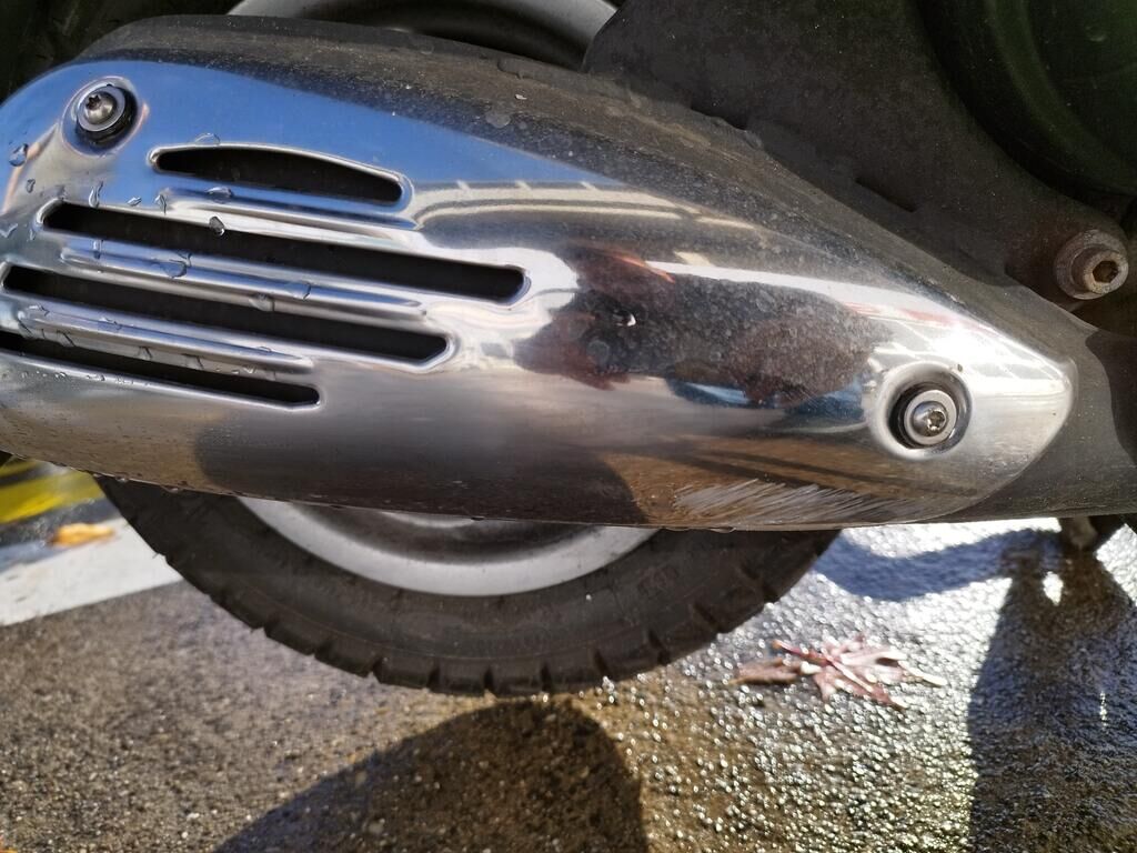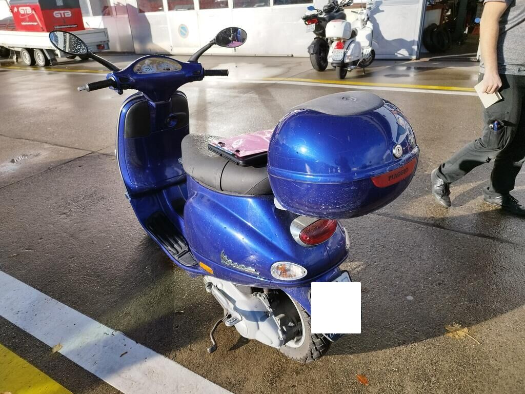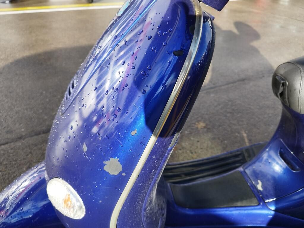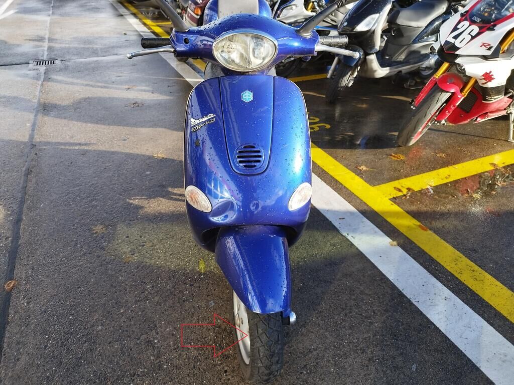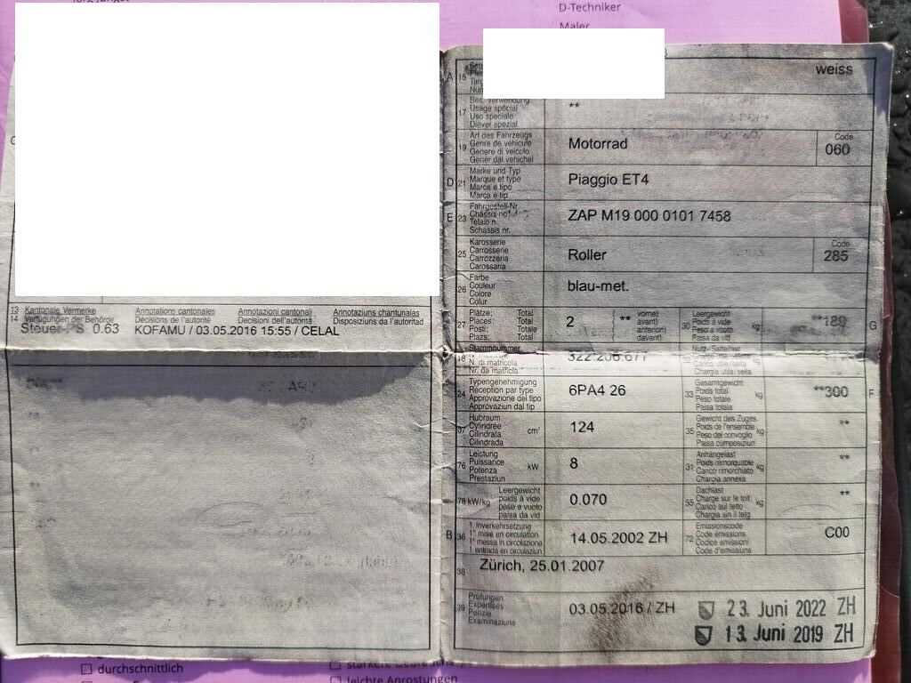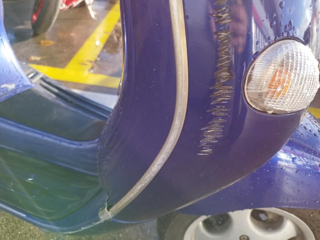 Der Lenker ist schräg, das Rad vorne steht schräg, der Kotflügel vorne hat Kratzspuren, der Rahmen vorne hat eine Delle und Kratzspuren, der Bremshebel rechts hat Kratzspuren, der Spiegel rechts hat Kratzspuren, die Chromleiste rechts hat Kratzspuren, das Trittbrett rechts hat Kratzspuren und ist gerissen, der Rahmen hinten rechts hat Kratzspuren und eine Delle, das Hitzeschild hat Kratzspuren, das Top Case hat Kratzspuren.