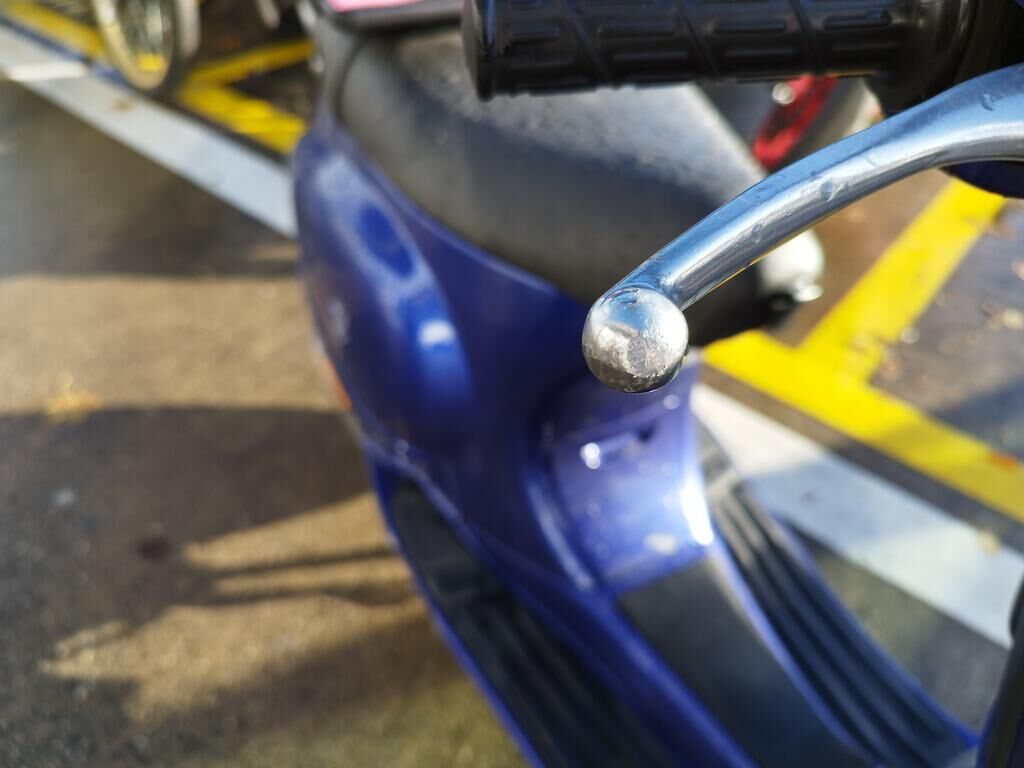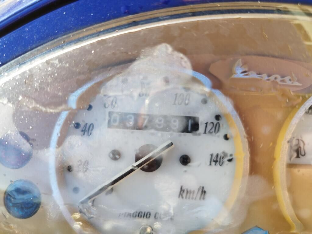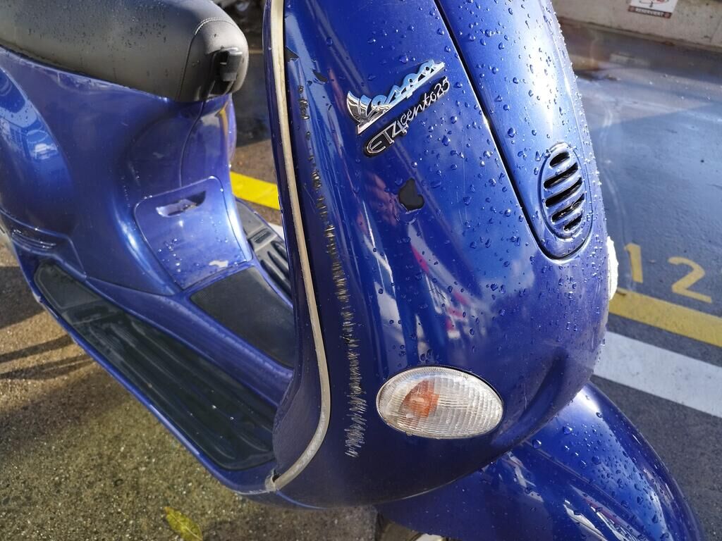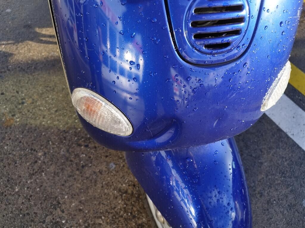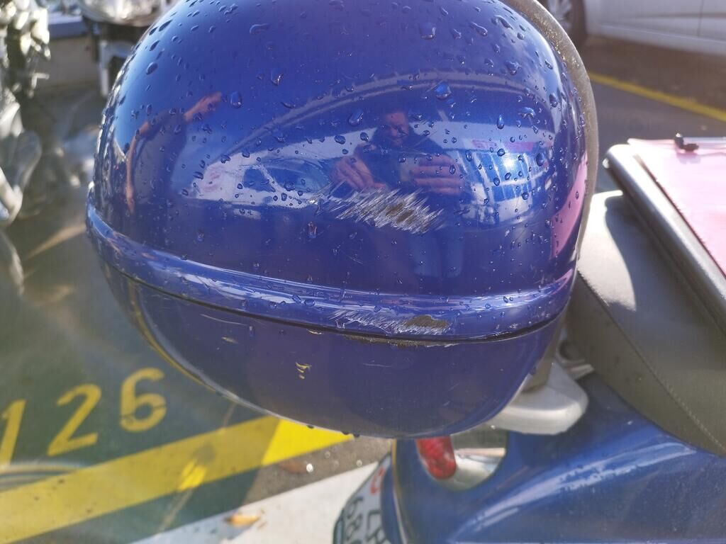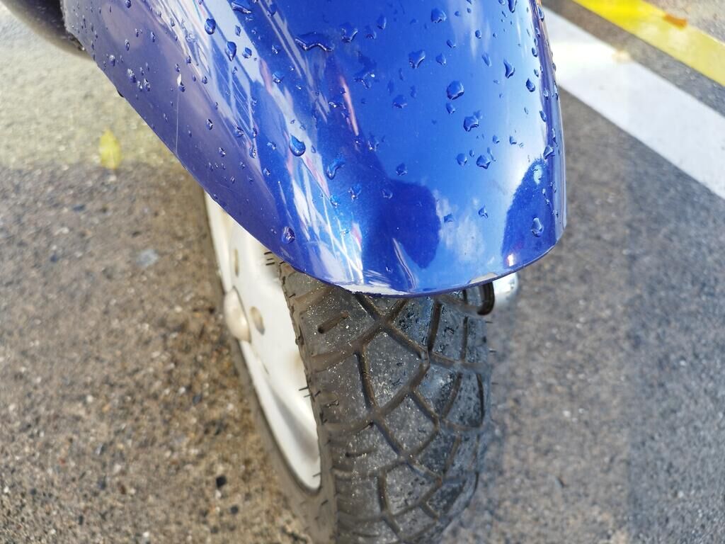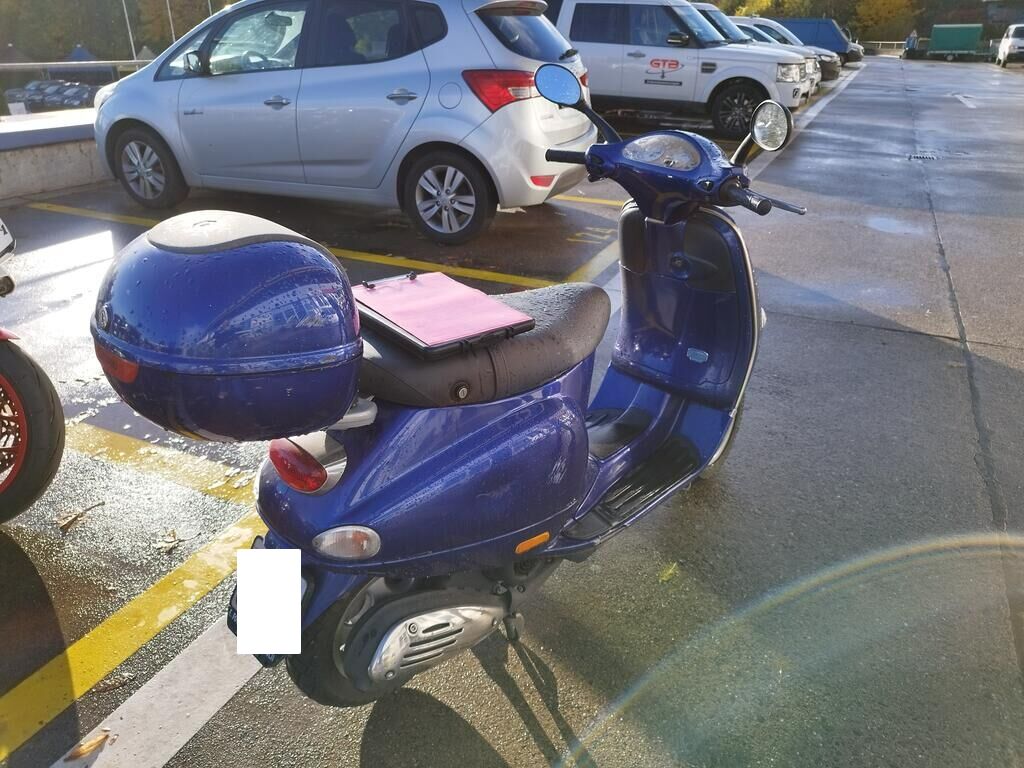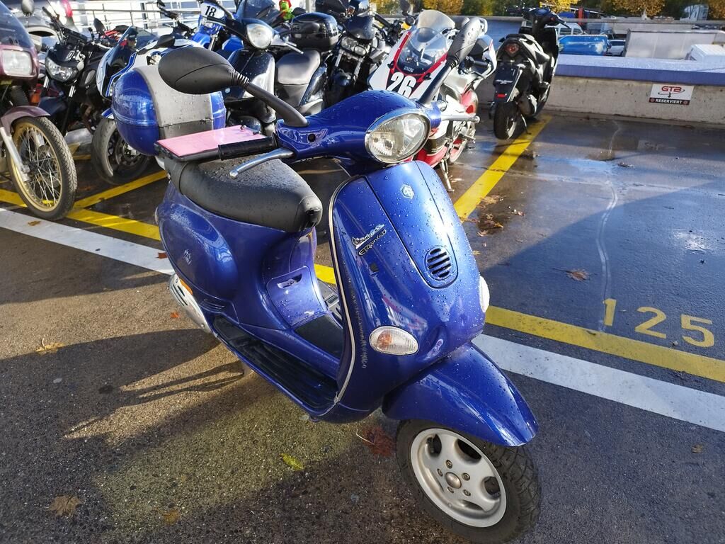 Der Lenker ist schräg, das Rad vorne steht schräg, der Kotflügel vorne hat Kratzspuren, der Rahmen vorne hat eine Delle und Kratzspuren, der Bremshebel rechts hat Kratzspuren, der Spiegel rechts hat Kratzspuren, die Chromleiste rechts hat Kratzspuren, das Trittbrett rechts hat Kratzspuren und ist gerissen, der Rahmen hinten rechts hat Kratzspuren und eine Delle, das Hitzeschild hat Kratzspuren, das Top Case hat Kratzspuren.