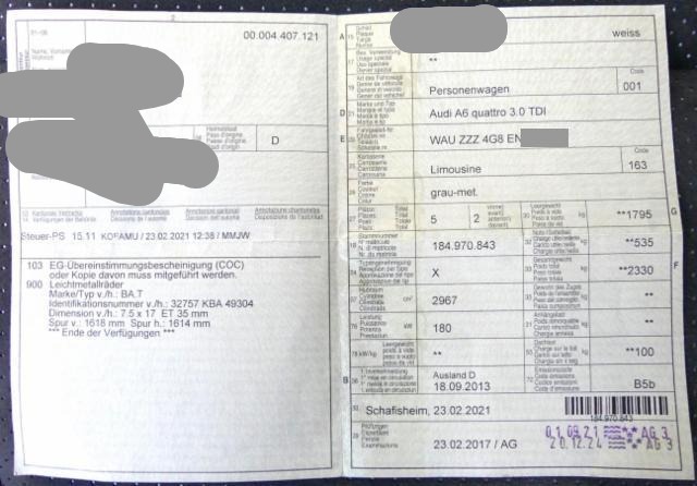Wichtige HinweiseZustandFahrzeug muss transportiert werden [Höhe und Breite beachten]. Fahrzeug ist rollbar. Bereifung Fahrzeug wird mit Sommerräder abgegeben. Sonstiges Fahrzeugdokumente vorhanden. BeschädigungenHeck Seitenwand hinten rechts eingedrückt/aufgestaucht. Achse Hinterachse rechts beschädigt. AusstattungSerienaustattung Sitzheizung für Vordersitze Lendenwirbelstützen elektr. für Vordersitze Durchladesystem inkl. Skisack Mittelarmlehne vorne Fahrer-Informationssystem FIS Tempostat Airbag Fahrer und Beifahrerseite Seitenairbag Fahrer und Beifahrerseite Elektronische Wegfahrsperre Servotronic Lenksäule mit Höhen- und Längseinstellung Seitliches Kopfairbagsystem SIDEGUARD Elektrische Fensterheber vorne + hinten Multifunktions-Lenkrad 4-Speichen Reifendruck-Kontrollsystem RDK Reserve-Notrad Scheinwerfer Reinigungsanlage ABS und EBV Elektr. Bremskraftverteilung Bremsassistent EBA ESP Elektronisches Stabilitätsprogramm ASR und EDS Antriebsschlupfregelung und Differrentialsperre Dieselpartikelfilter DPF Rücksitzlehne geteilt 1/3 oder 2/3 / umklappbar Grösserer Kraftstofftank Elektromechanische Parkbremse Endrohrblende Licht- und Regensensor Audi Sound System MMI Radio plus Audi hold assist Bluetooth Schnittstelle Audi pre sense basic Stop + Start System Dekoreinlagen in Micrometallic platin Sitzbezüge in Stoff Effekt Leichtmetallräder 17" 6-Arm Design Keine Gewähr auf die Angaben der Serienausstattungen Komfort Klimaautomatik SonderausstattungDachhimmel schwarz/ Stoff Tiptronic Multifunktions-Sportlenkrad 3-Speichen in Leder Metallic-/ Perleffekt-Lackierung Lichtpaket Automatisch abblendbarer Innenspiegel Pack Exterieur S-Line Adaptive air suspension Klimaautomat Vier-Zonen Bose Sound System Autotelefon Bluetooth Pack Leder Fahrerinformationssys. mit Farbdisplay + Effizienzprogramm Audi Parking System plus Rückfahrkamera S-Line-Leder Alcantara/ gelocht Pack S-Line |