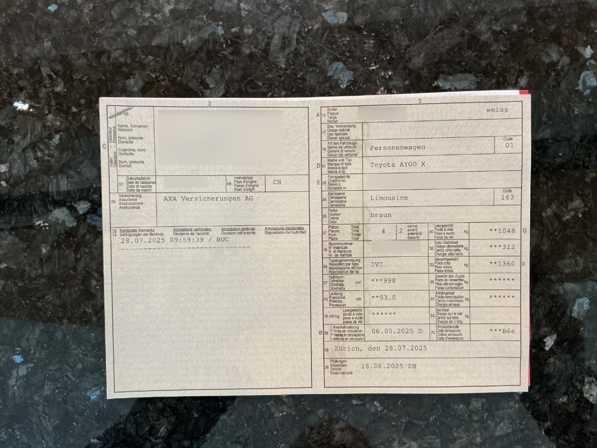 Lenkrad: Lederlenkrad, Assist: Geschwindigkeitsbegrenzer ASL, Sitze: Beifahrersitz 4 -fach manuell verstellbar, Media: USB Anschlüsse vorne (1x USB-C), Lackierung: Uni-Lackierung, Räder: Reifendruckkontrollsystem, Klima: Manuelle Klimaanlage mit Pollenfilter, Sitze: Fahrersitz 6-fach manuell verstellbar, Türgriffe aussen Wagenfarbe, Wegfahrsperre elektronisch, Sonnenblenden mit Spiegel Fahrerseite beleuchtet, Antiblockiersystem (ABS), Media: 9" Multimedia Display Toyota Touch 3, Garantie: 3 Jahre/100’000 km - Lackgarantie 3 Jahre/Kilometer unbegrenzt - Duchrostungsgarantie 12 Jahre/Kilometer unbegrenzt, Sitze: Fahrersitz höhenverstellbar, Sitze: 2. Sitzreihe abklappbar 50:50, Servolenkung, Lenkrad: Lenkrad mit Bedienelementen, Airbag: Kopfairbags vorne und hinten, Airbag: Seitenairbag für Fahrer und Beifahrer, Kopfstützen 2. Sitzreihe fix, Elektronisches Stabilitäts-Programm (ESP), Aussenspiegel in schwarz, Aussenspiegel elektrisch verstellbar und beheizbar, Polster: Stoff, Getriebe: 5-Gang-Getriebe, Media: Radio, DAB+ und Bluetooth, Assist: Verkehrsschilderkennung (RSA), Licht: Fernlicht-Automatik (AHB), Assist: Rückfahrkamera, Assist: Adaptiver Tempomat ACC, Licht: LED-Tagfahrlicht, Lederbezogener Schaltknauf, Fensterheber vorne elektrisch, Zentralverriegelung mit Fernbedienung, Media: MyT App Connected Services (10 Jahre gratis) - Abrufen von Parkposition, Routenimport, Fahrzeugstatus, Warnleuchten, Inspektionserinnerung, 12 V-Anschluss vorne, Airbag: Airbag Fahrer und Beifahrer, Räder: 17" Stahlfelgen mit 175/65 R17 Reifen, Media: Smartphone Integration: Apple CarPlay ohne Kabel / Android Auto ohne Kabel, Medfia. 4 Lautsprecher, Assist: Spurverfolgungsassistent (LTA) mit Spurverlasswarner (LDA) und aktiver Lenkunterstützung, Assist: Pre Collision System mit Fussgänger- und Fahrraderkennung (PCS), Elektronische Traktionskontrolle