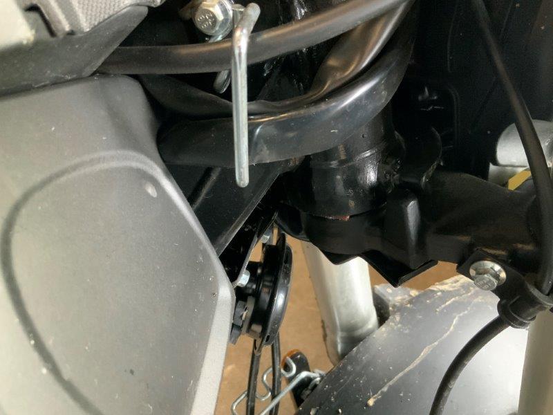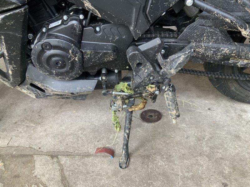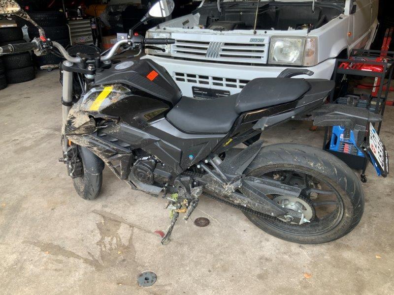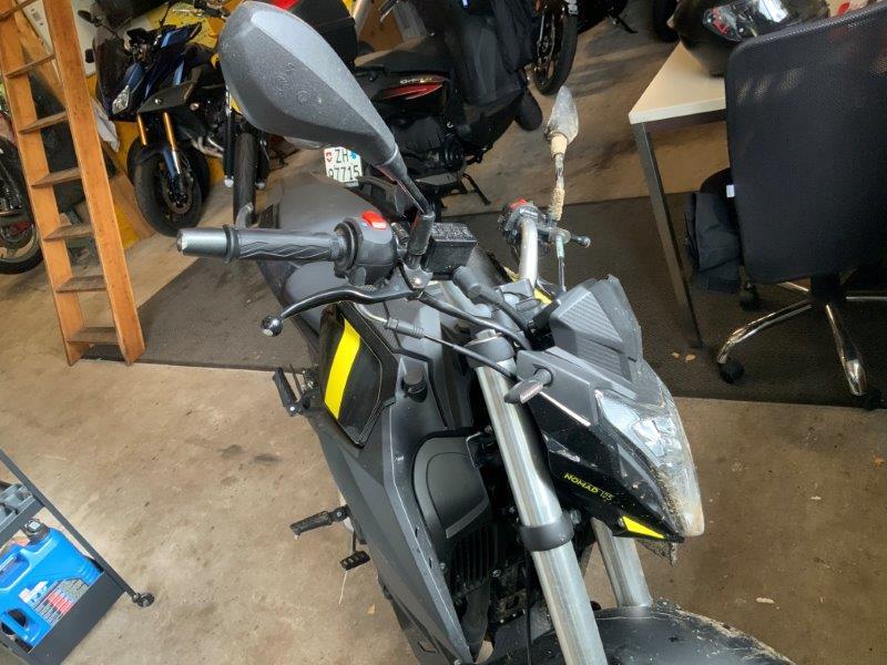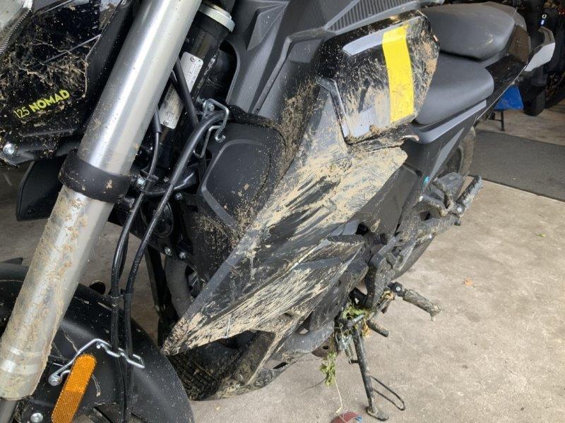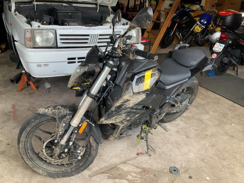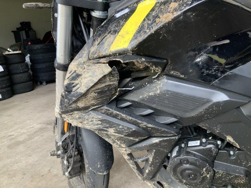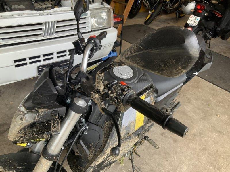 Diverse Verkleidungen und Anbauteile beschädigt. Lenkanschlag am Rahmen verbogen.