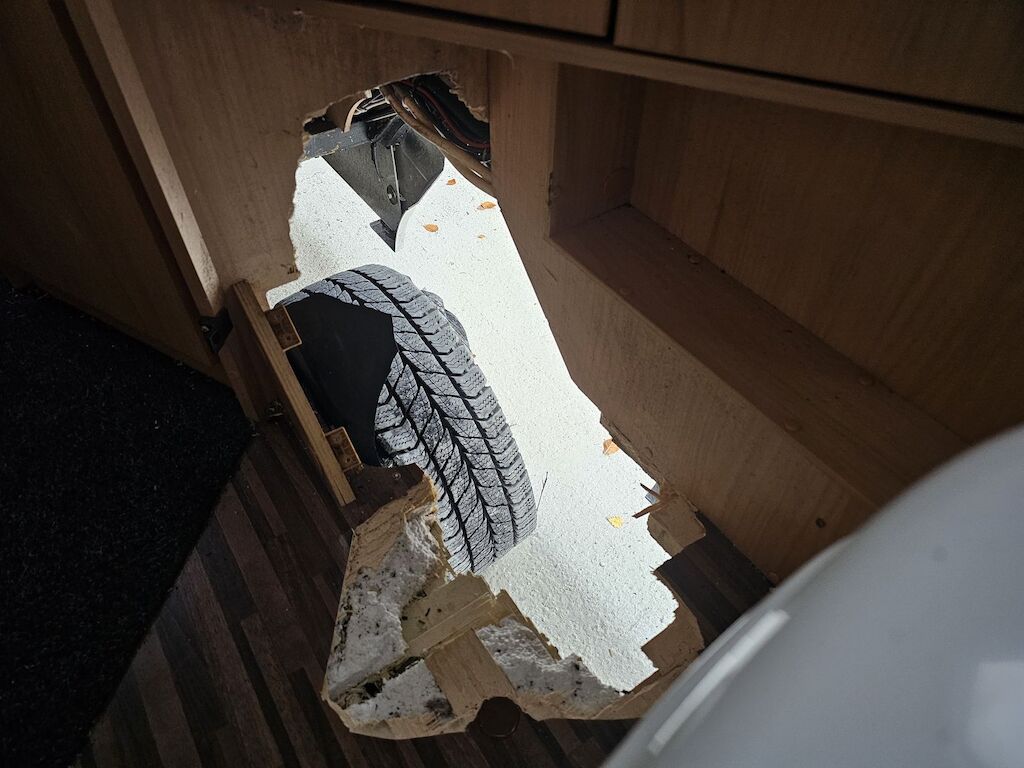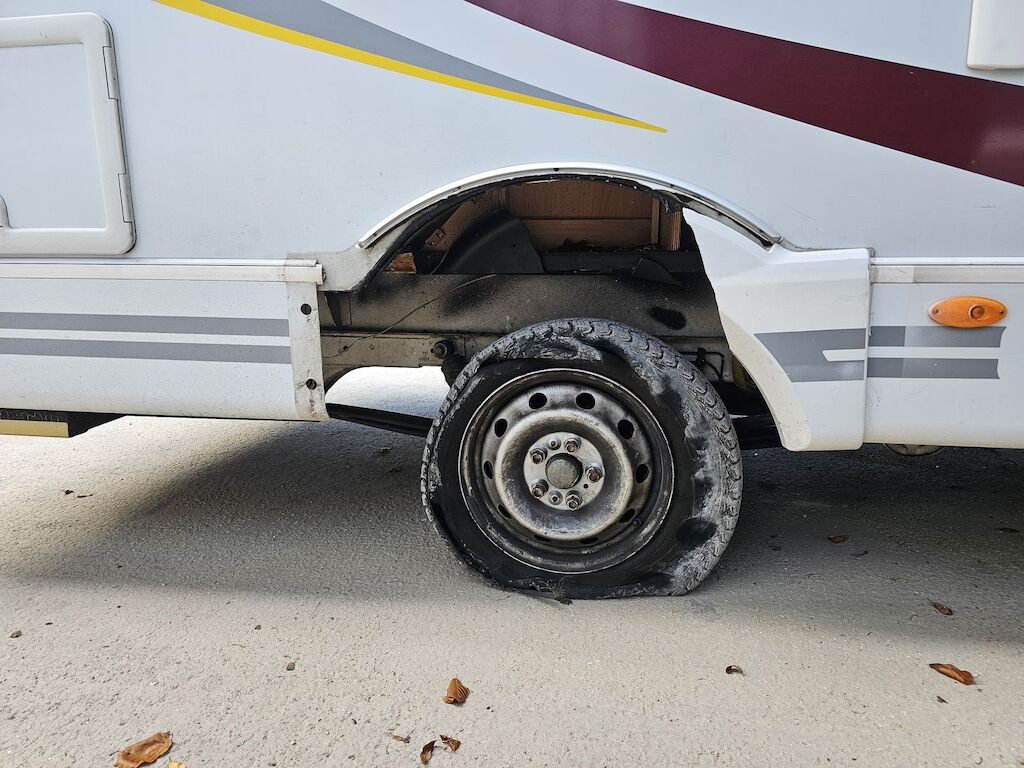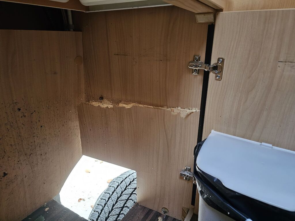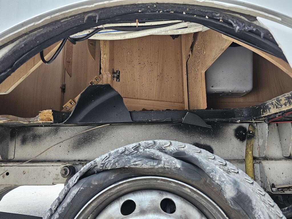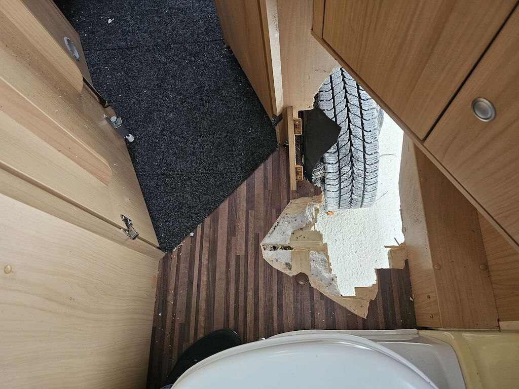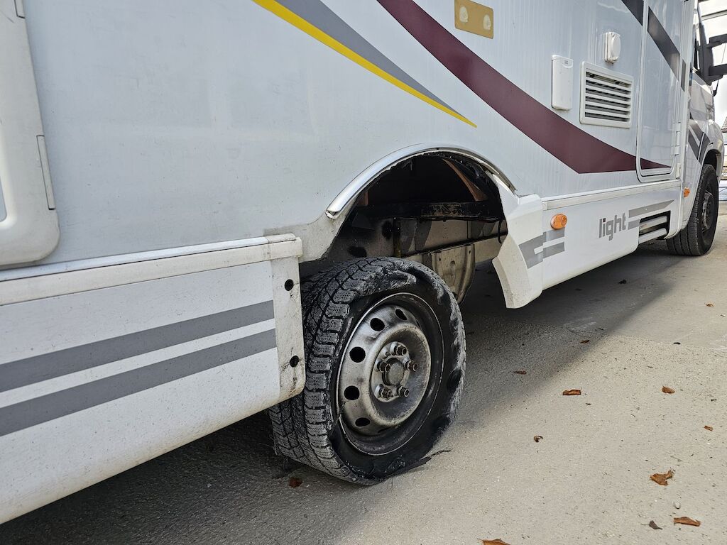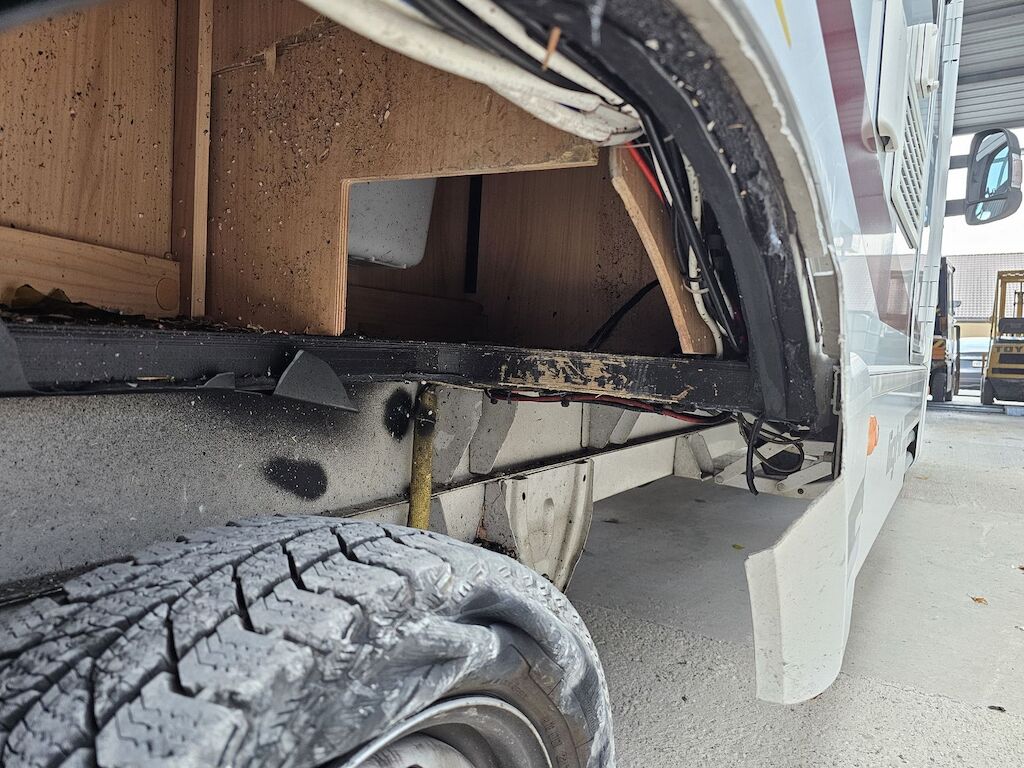 Consécutif à l'éclatement du pneu arrière droit : amortisseur, jupes latérales et moulure du passage de roue, cuvelage d'aile, plancher, meubles.