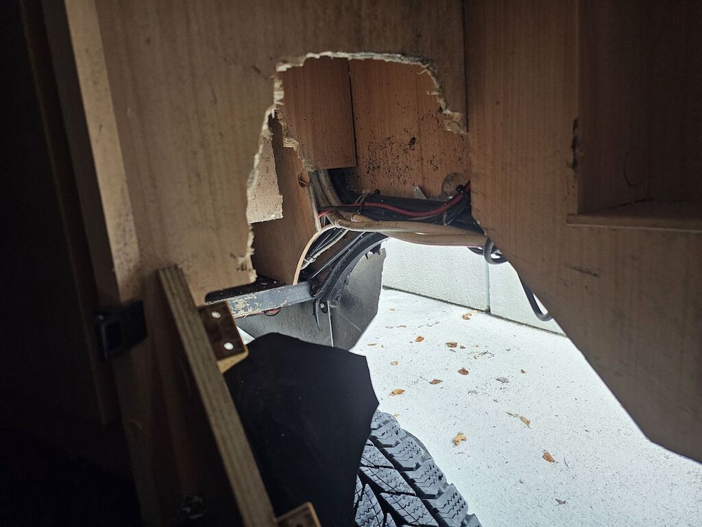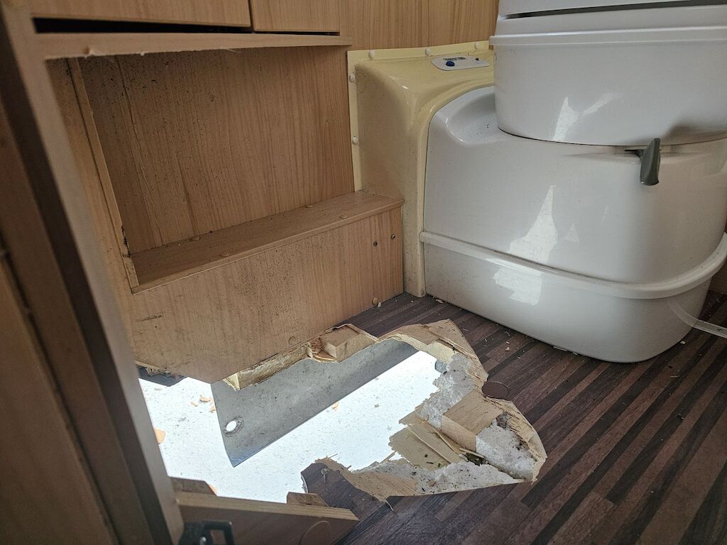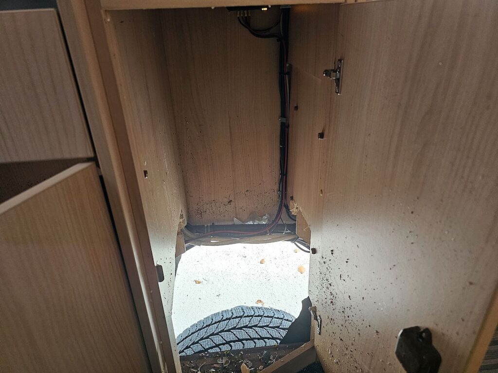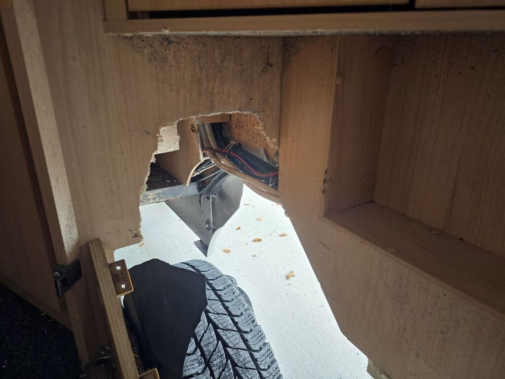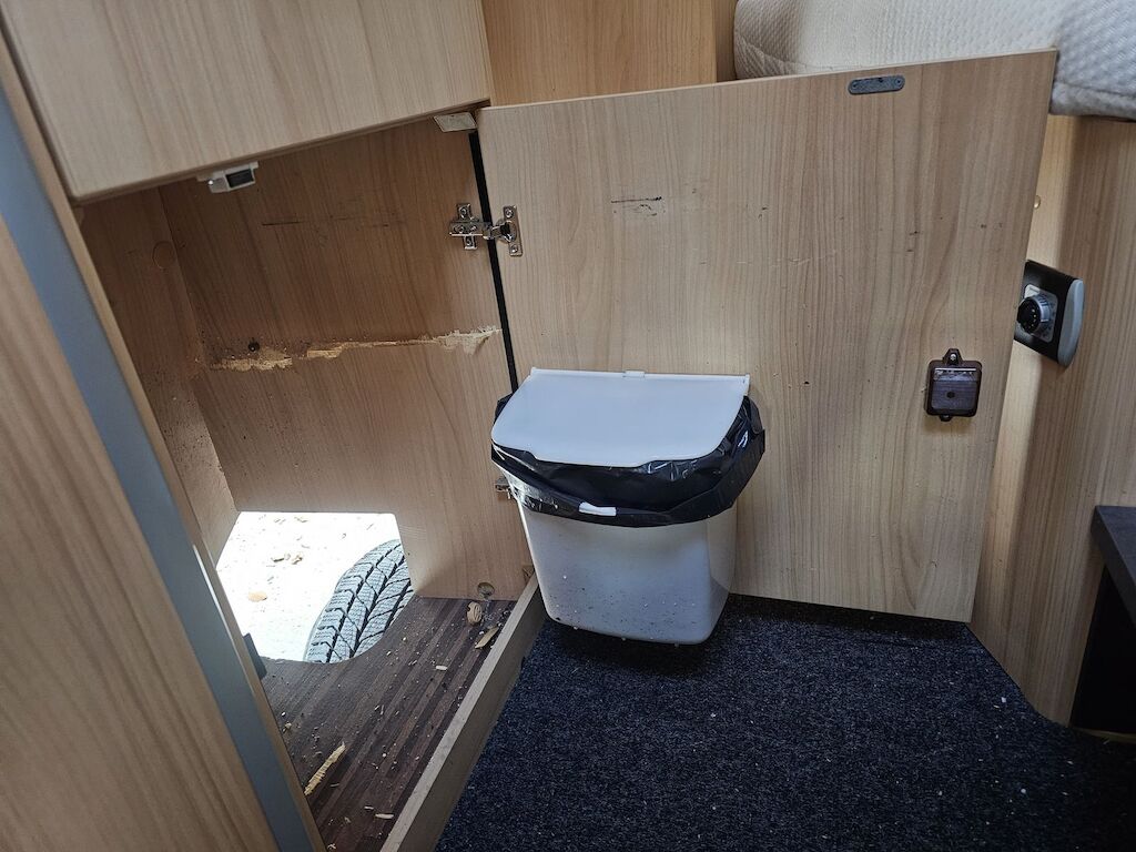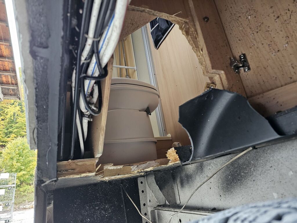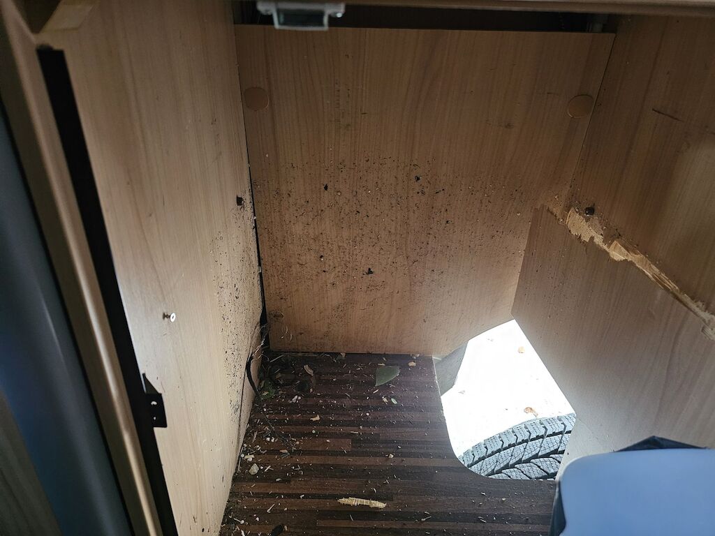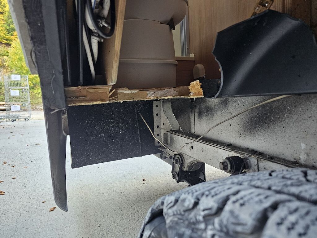 Consécutif à l'éclatement du pneu arrière droit : amortisseur, jupes latérales et moulure du passage de roue, cuvelage d'aile, plancher, meubles.